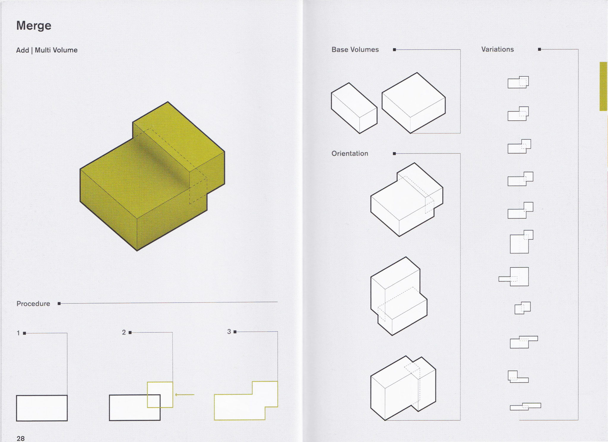 The operation of merging unifies multiple volumes into a single cohesive form through the intersection of their shared boundaries. When volumes overlap, their individual edges integrate at points of contact, creating a continuous geometry. The final form is determined by both the positioning of the original volumes and their areas of intersection. The result is a unified structure preserving key characteristics of its component parts.