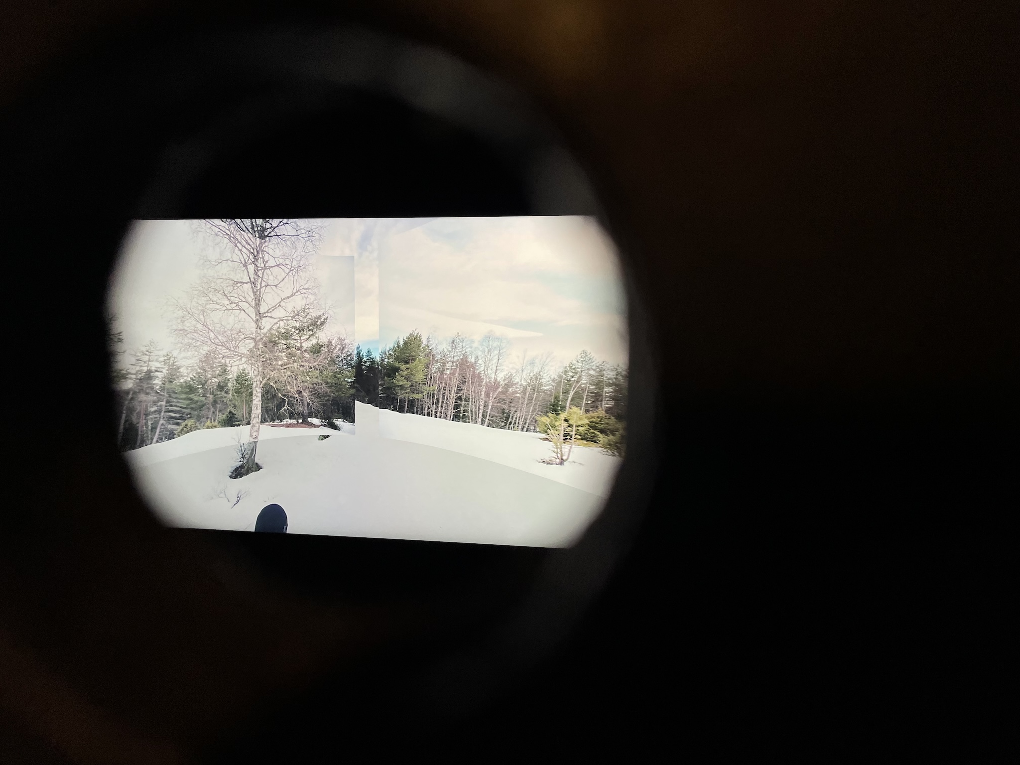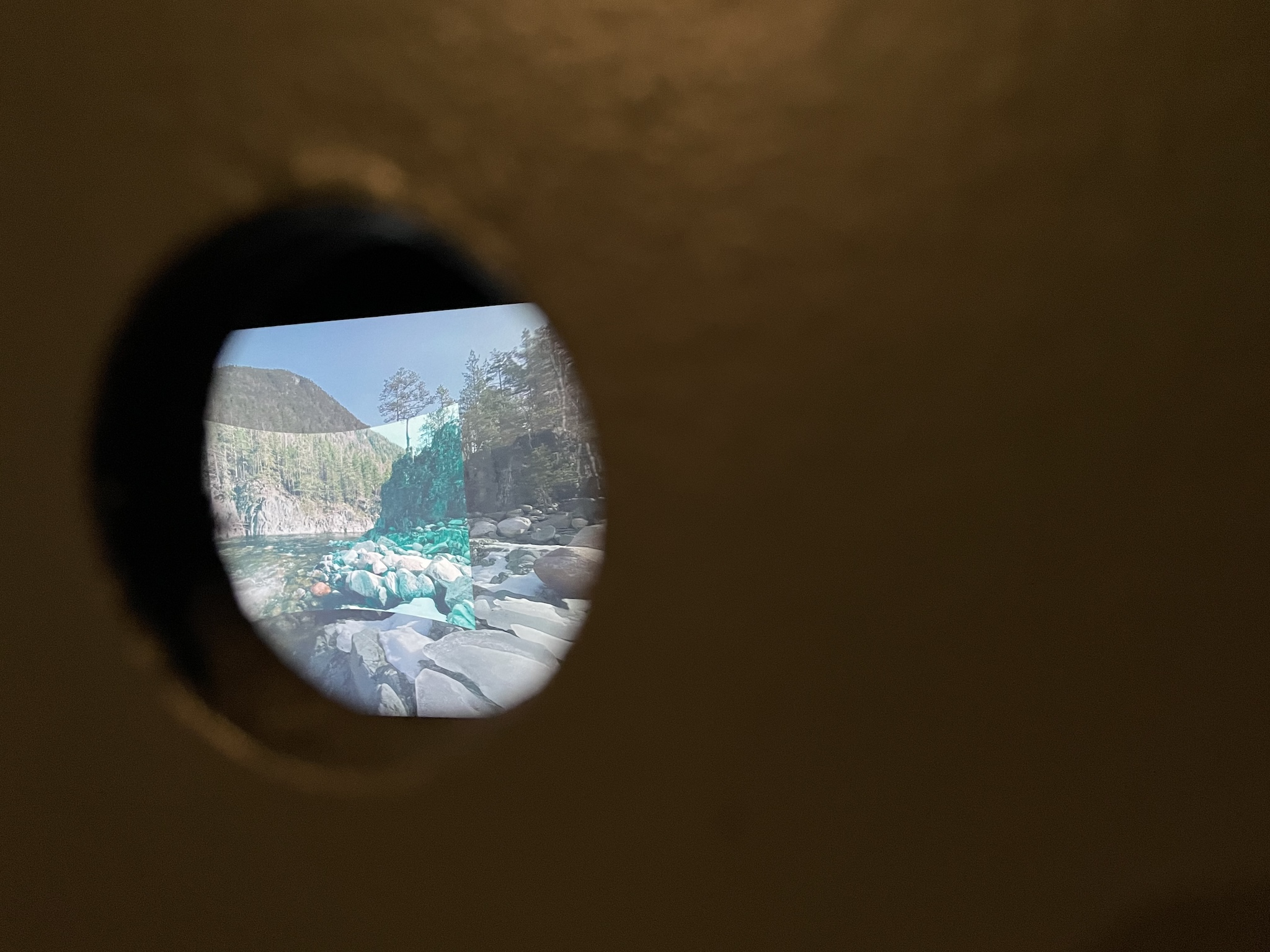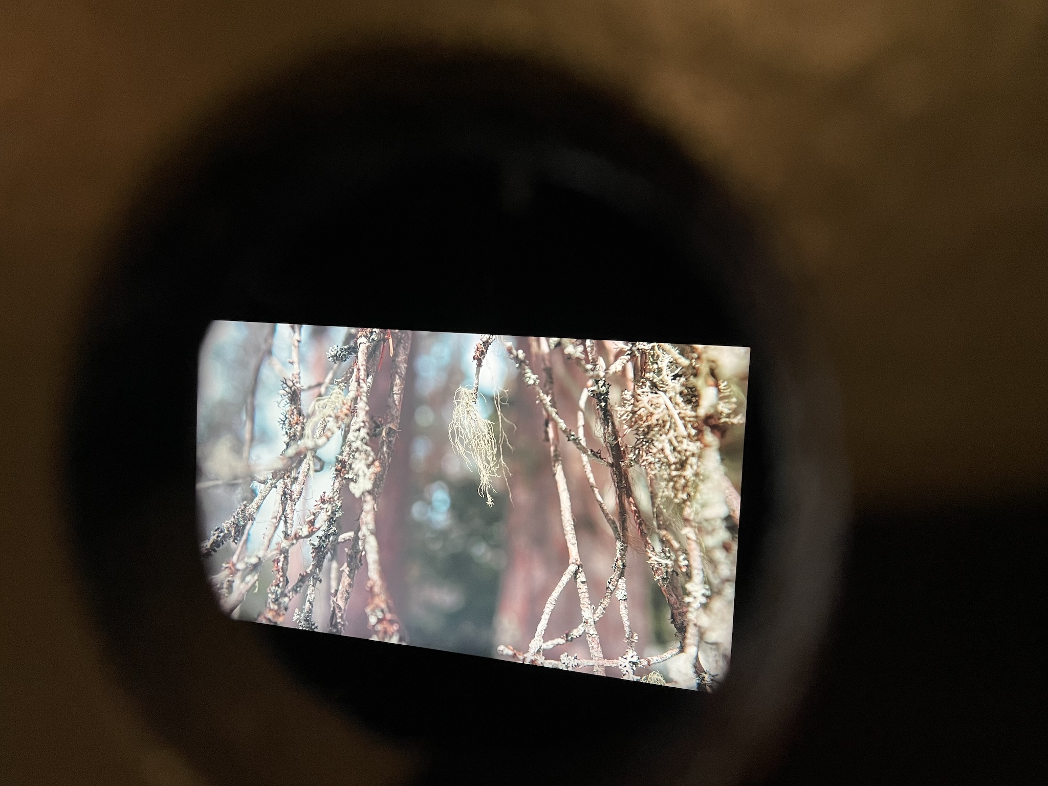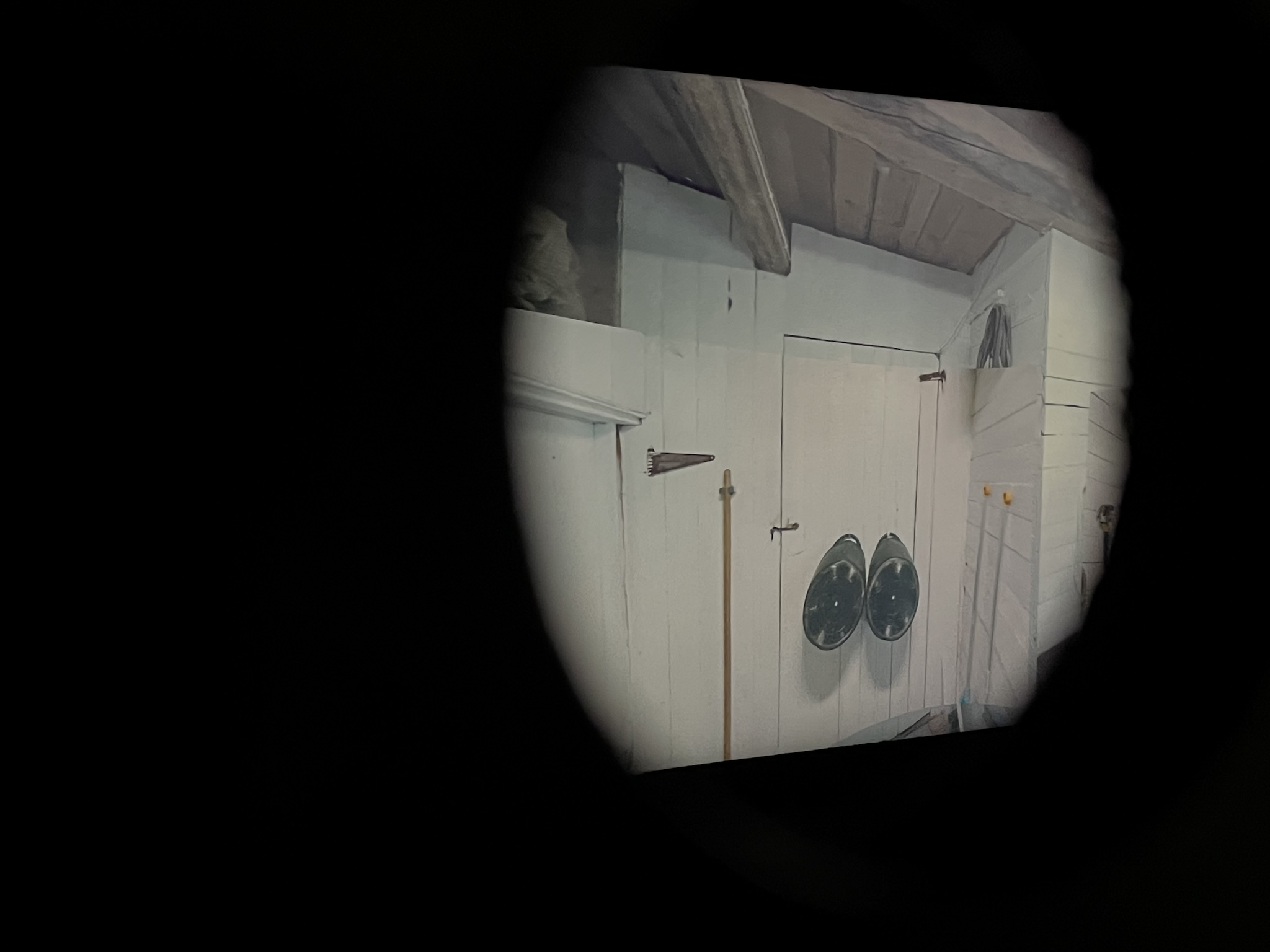 The videos shot through the peepholes are somewhat compromised as they are re-filming a film through a small hole, where exposure and focus become unstable. They are however a good illustration of the viewing and listening experience. Further below are a series of photos that likewise document the visual aspects of the work.