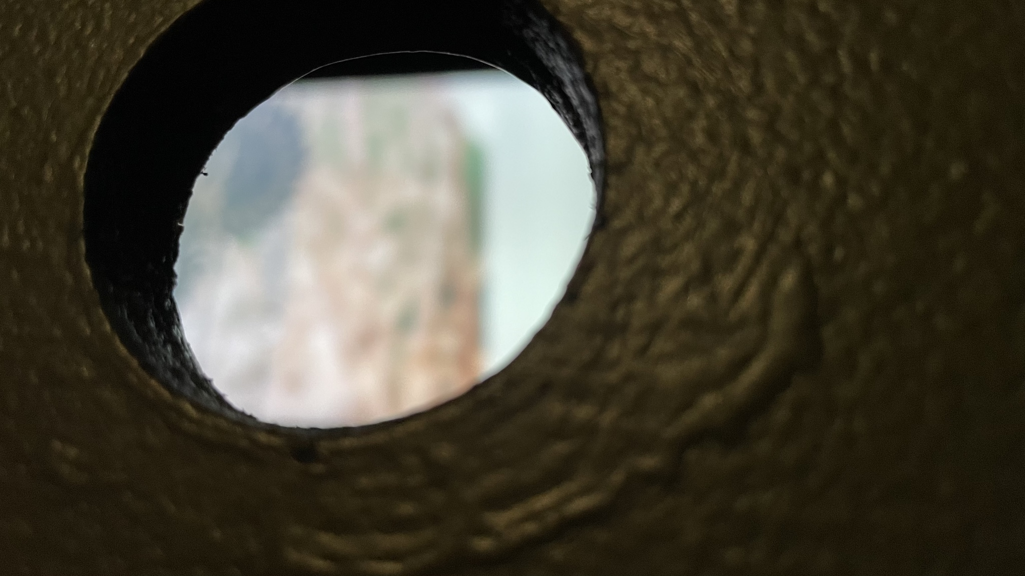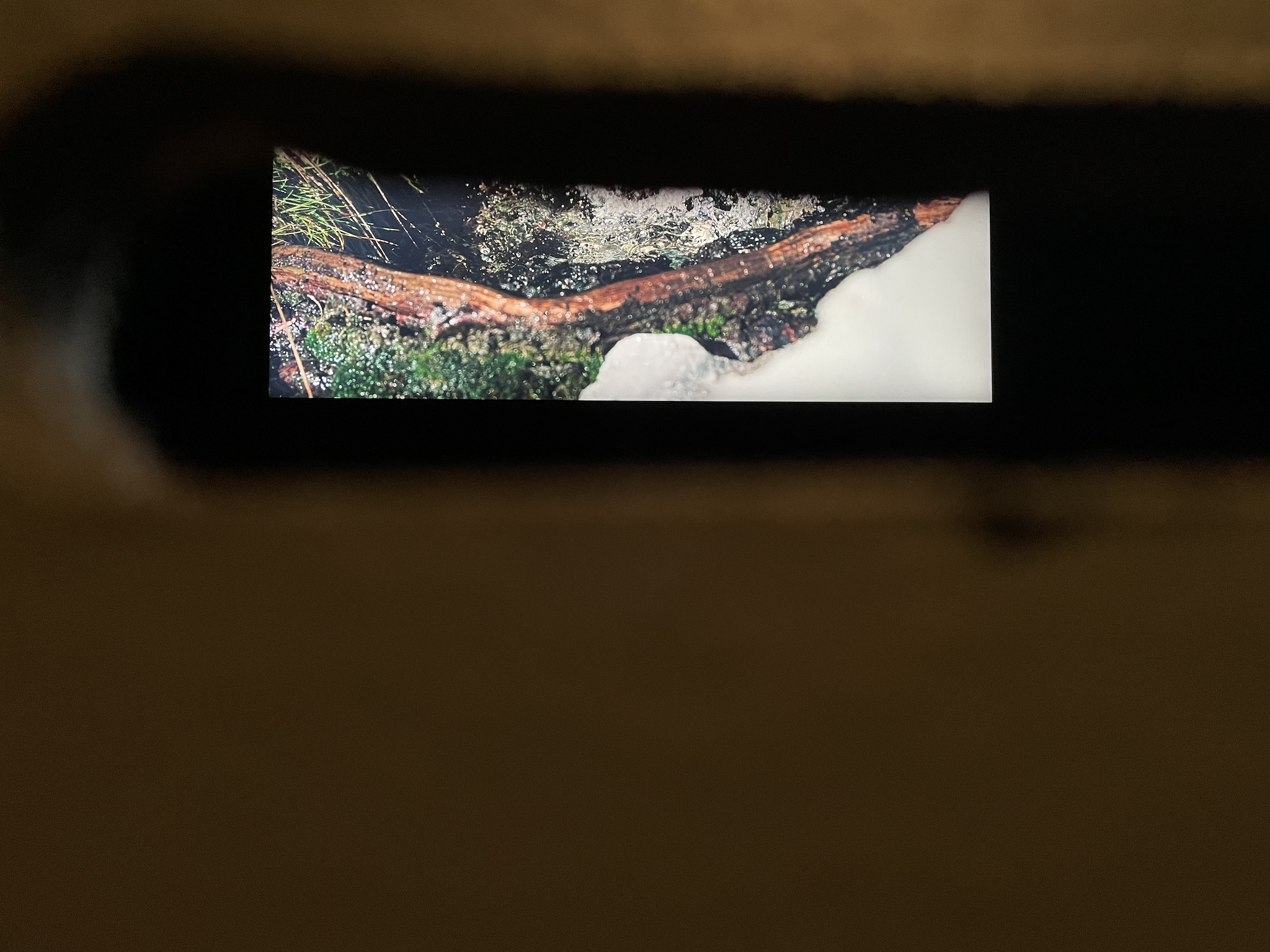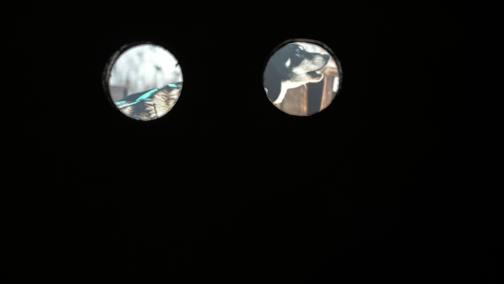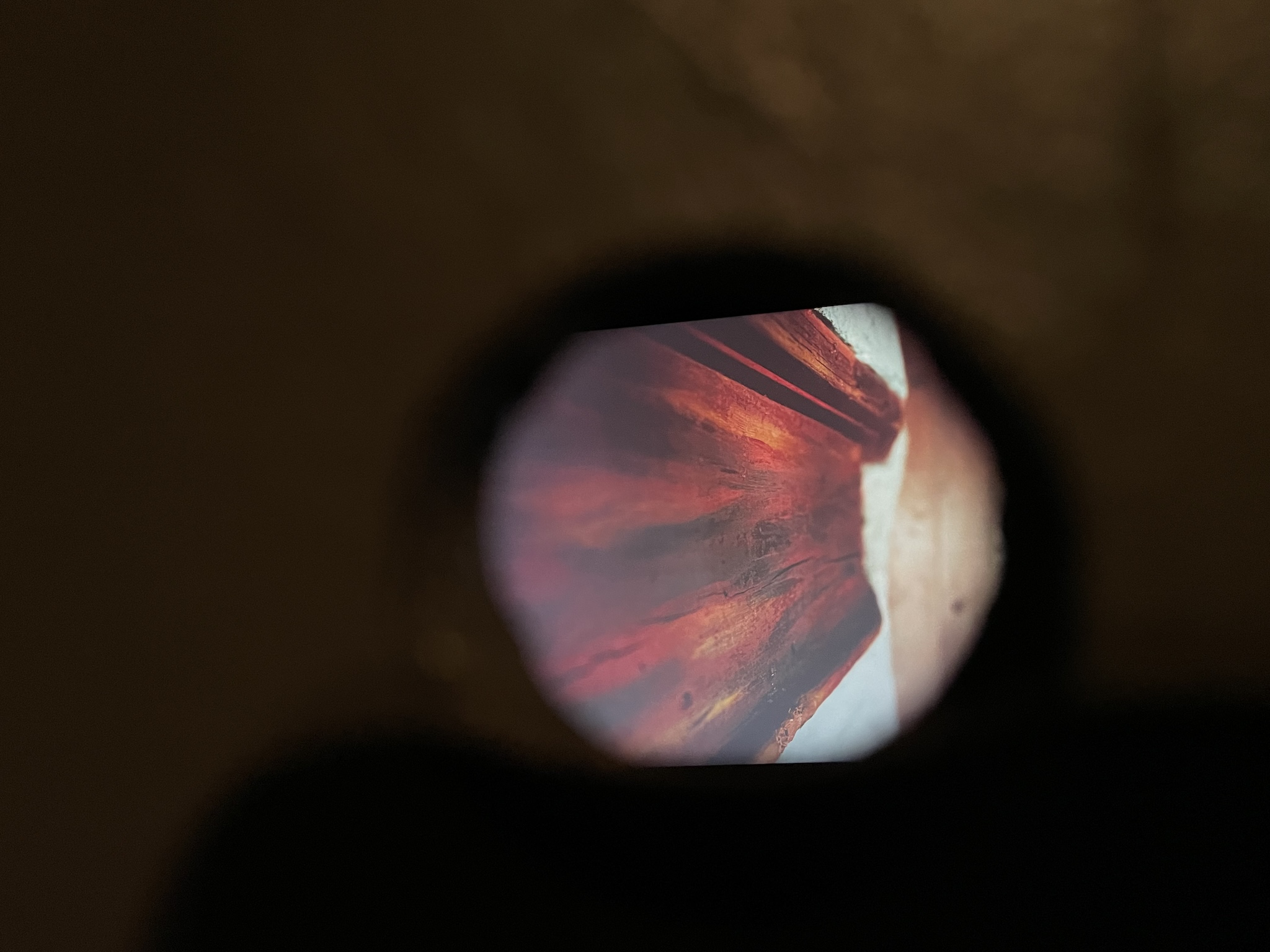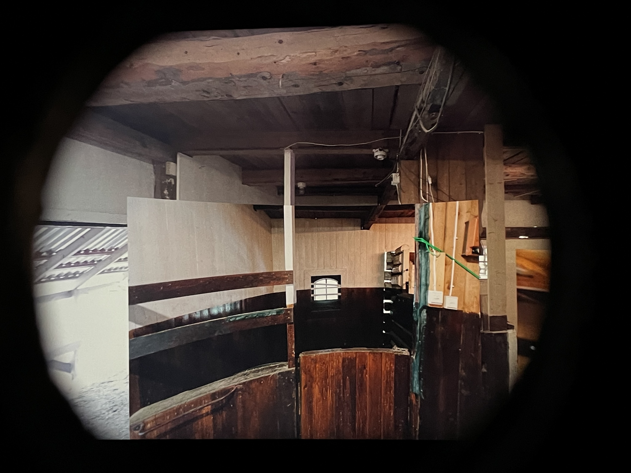 The videos shot through the peepholes are somewhat compromised as they are re-filming a film through a small hole, where exposure and focus become unstable. They are however a good illustration of the viewing and listening experience. Further below are a series of photos that likewise document the visual aspects of the work.