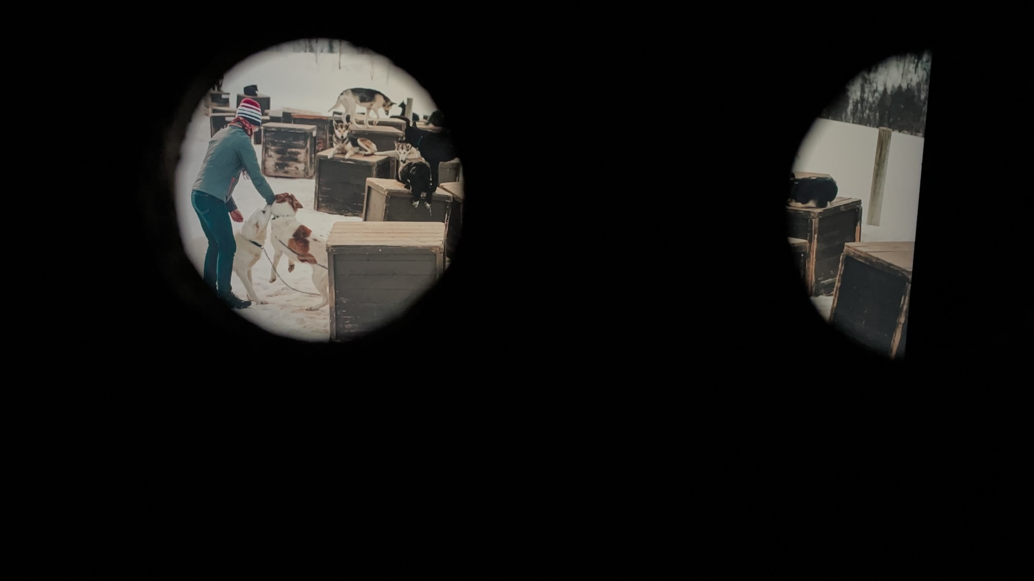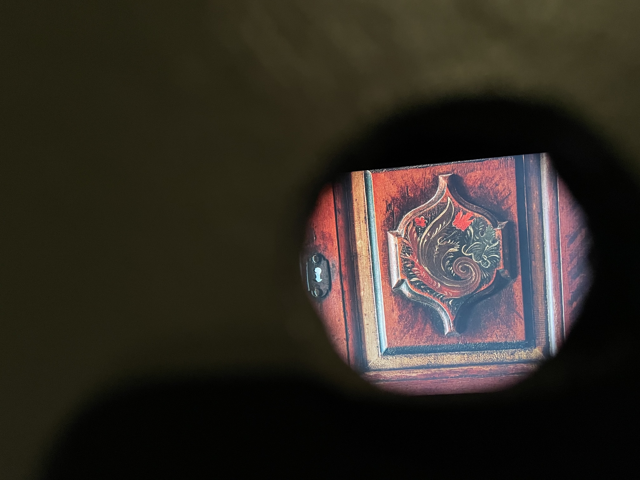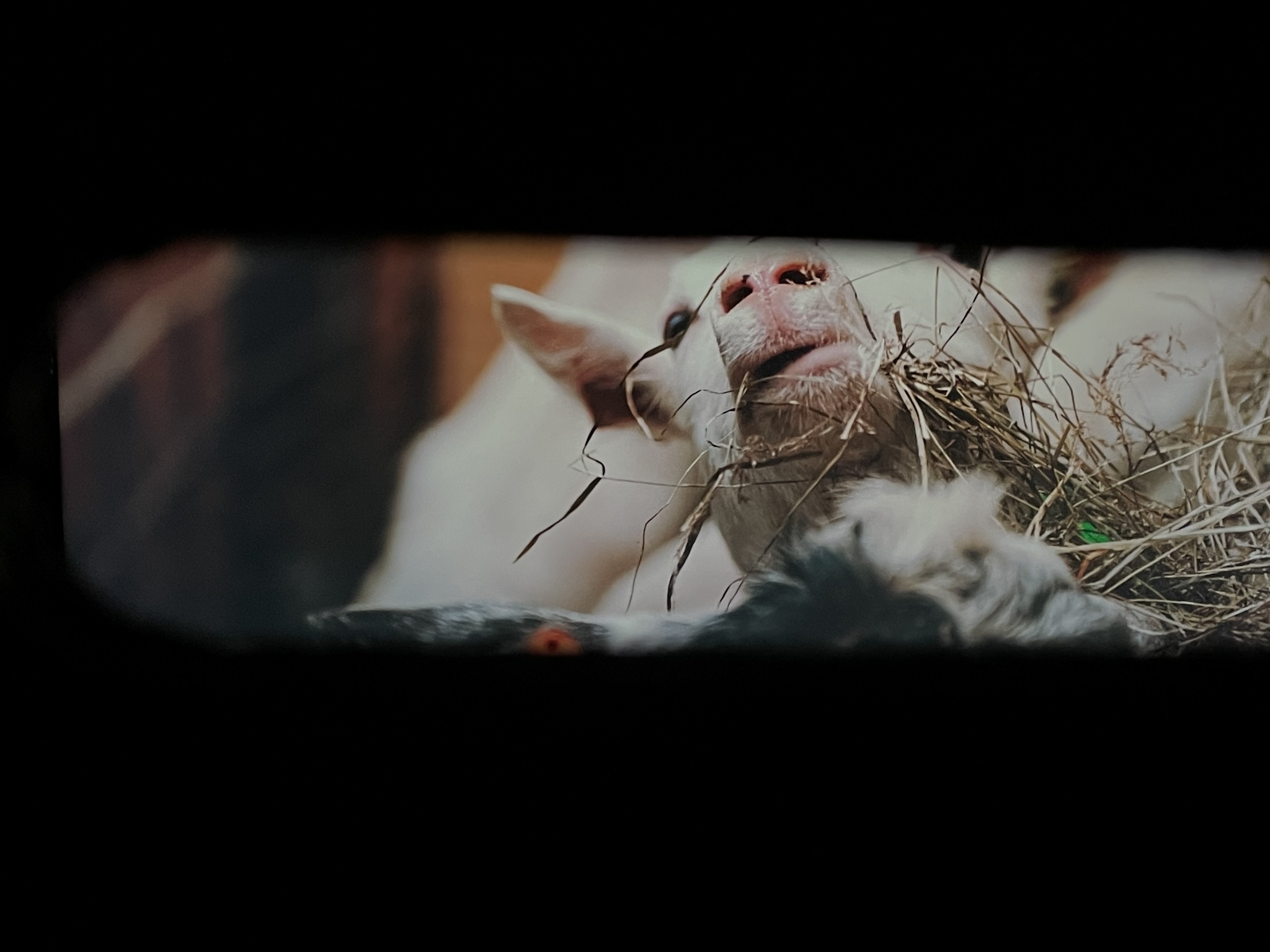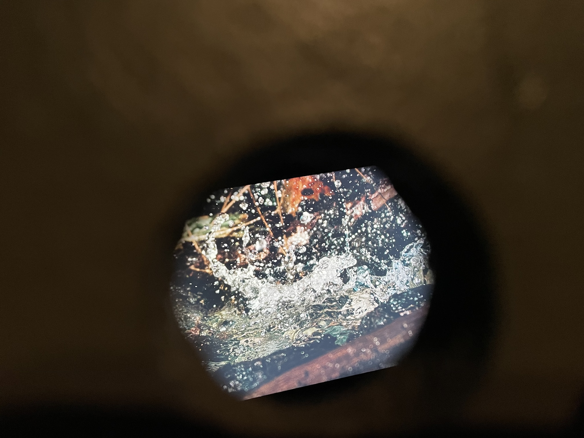 The videos shot through the peepholes are somewhat compromised as they are re-filming a film through a small hole, where exposure and focus become unstable. They are however a good illustration of the viewing and listening experience. Further below are a series of photos that likewise document the visual aspects of the work.