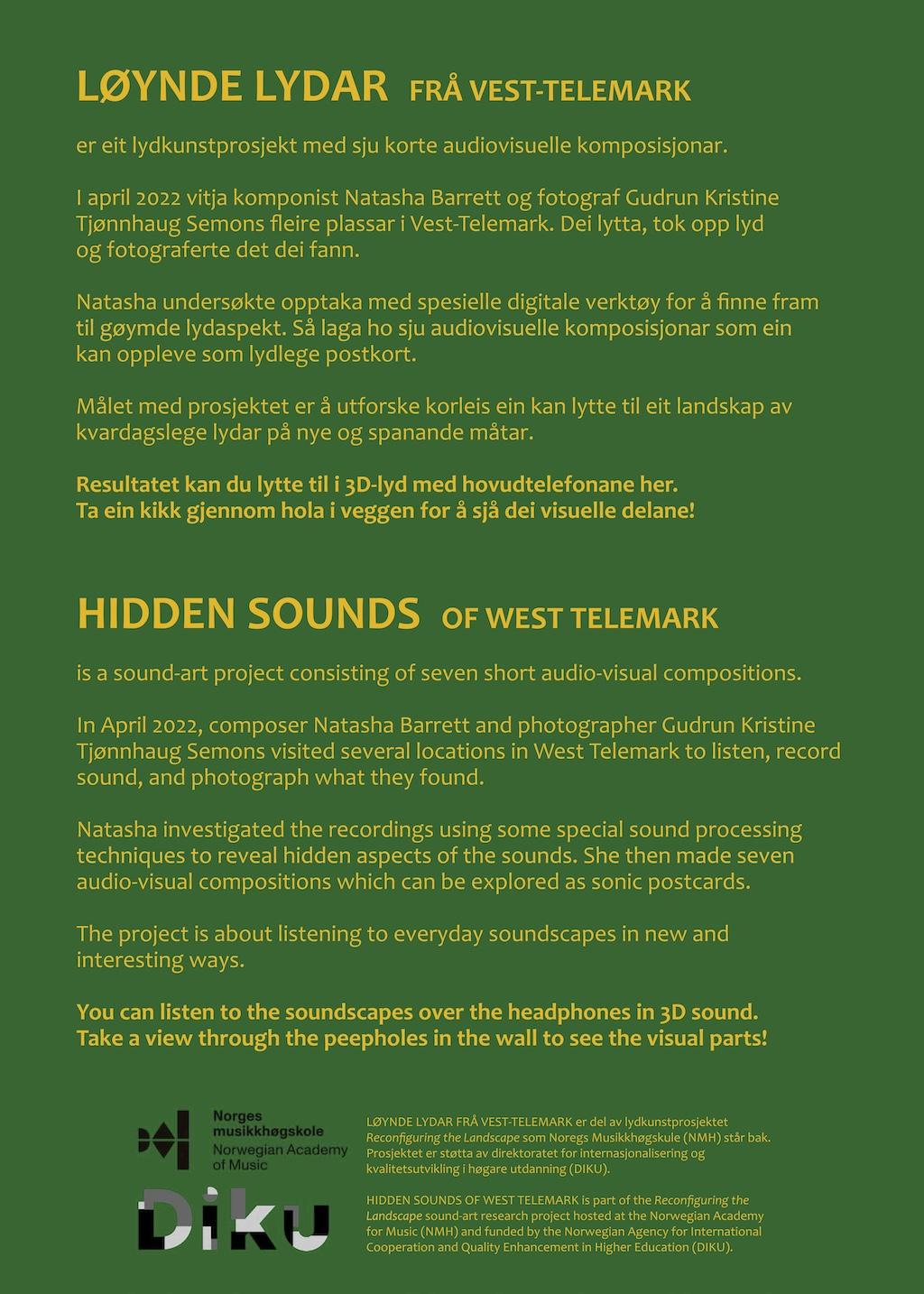 "Hidden Sounds of West Telemark / Løynde Lydar Frå Vest-Telemark" is a sound-art project consisting of seven short audio-visual compositions which can be thought of as sonic postcards. The project is about listening to the everyday cultural sound landscape in new and interesting ways.
