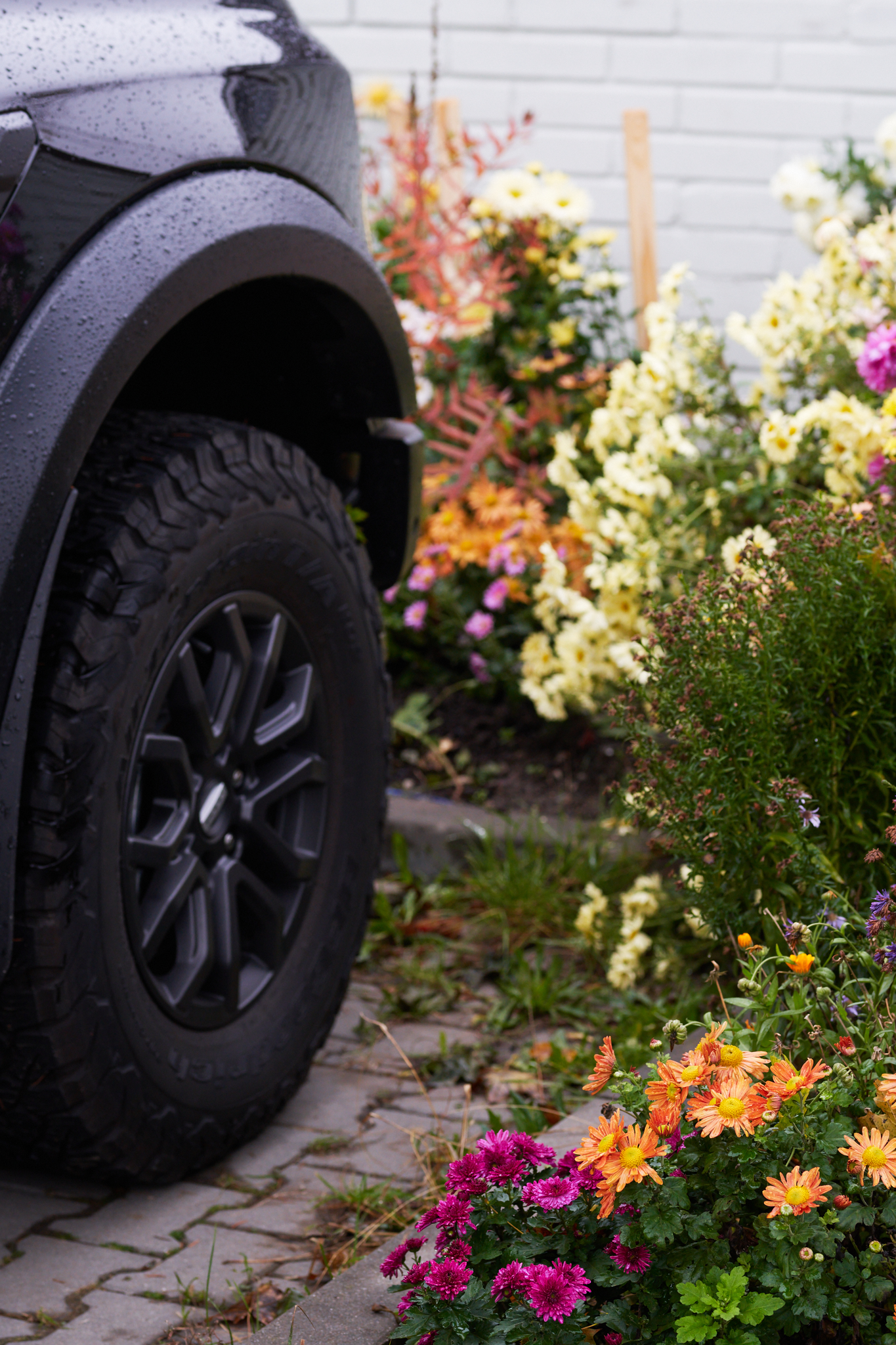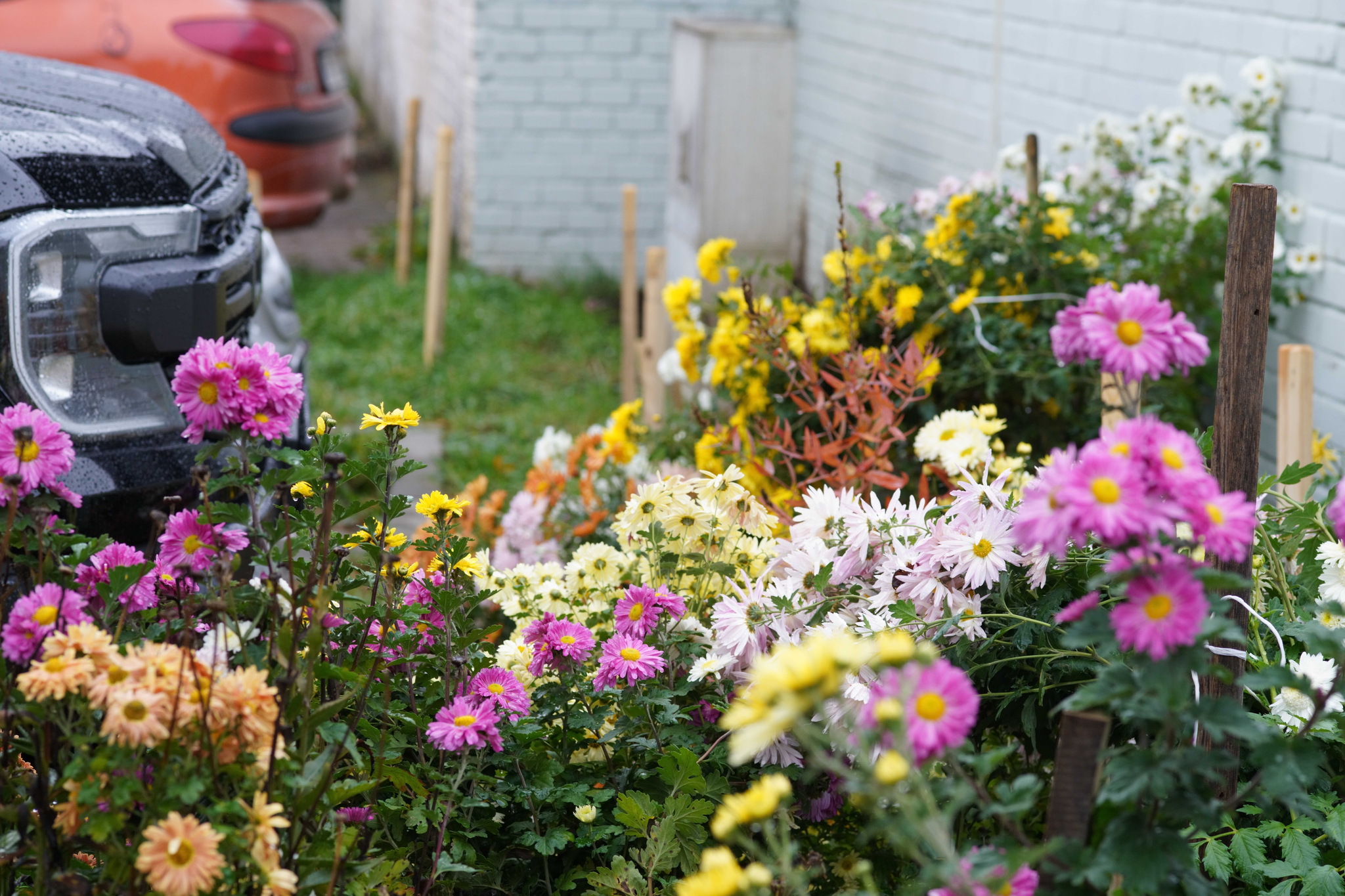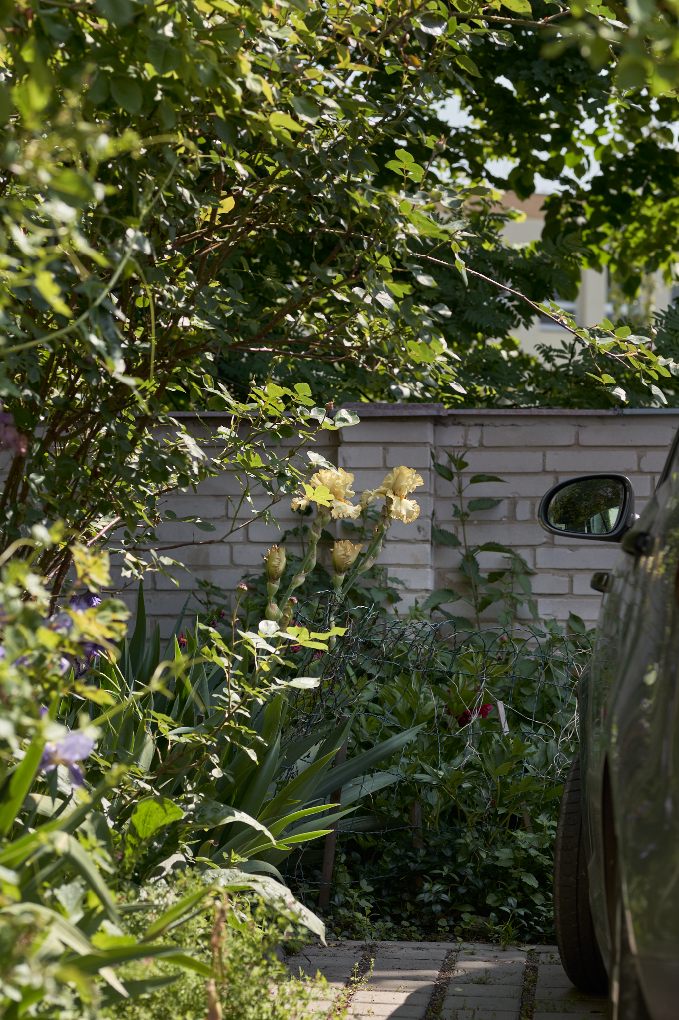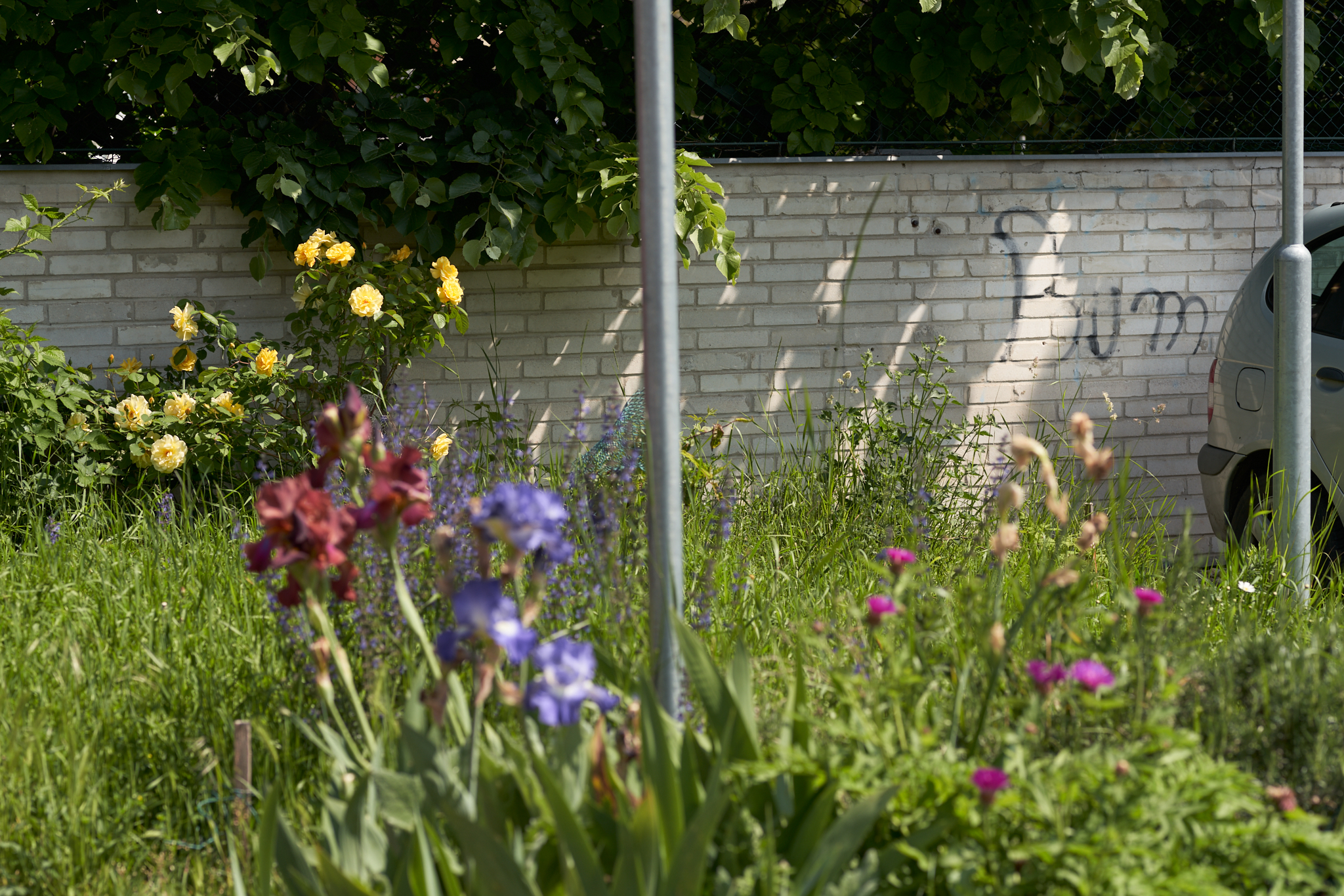Despite the fact that I delivered answers to the city council by nearly fifty respondents, of whom almost four-fifths were against more parking lots, the council organized their own gathering, where loud supporters of the parking lot prevailed, and construction started just two months after the public hearing. When the reconstruction was finished, I started planting shrubs and plants in the spaces that planners had left for greenery (I actually negotiated some of these spaces – at the time, I was a backbench council member of the city government and a member of the environmental advisory board to the council. The board’s view of the parking lot-vs.-park dilemma had been passive, i.e., silently supporting the parking lot). I planted several rambler roses and a climbing vine, and gradually started expanding with my “garden” into the large parking lot. I have since created a flowering border, which now contains 45 varieties of chrysanthemums and 15-20 iris varieties, combined with other plants which complement the irises in their flowering season. This year, I have planted about ten more rambler roses and a young acer tree. I want to bomb this desolate space which was a park just ten years ago with beauty, even if it is just at the fringes.