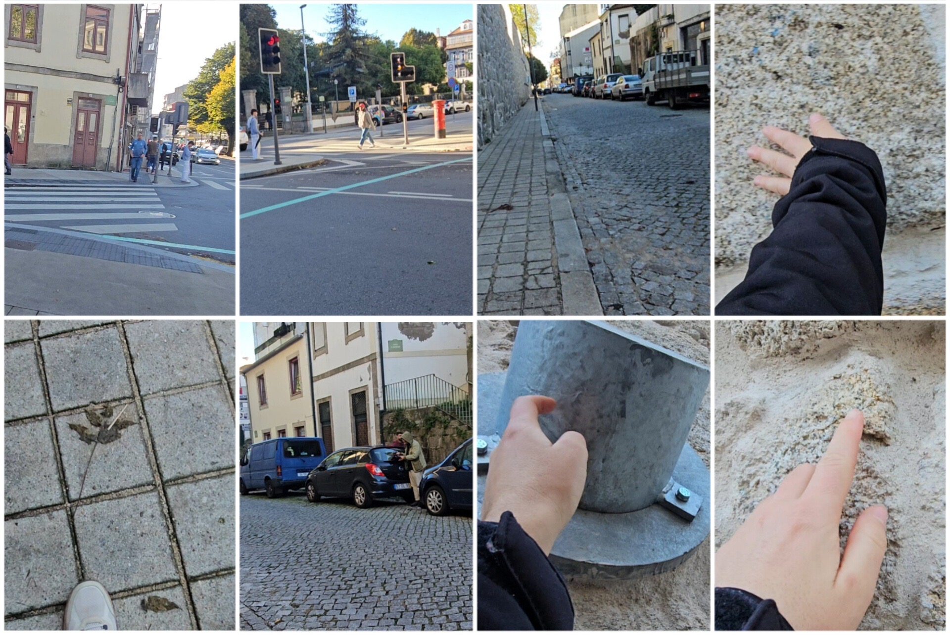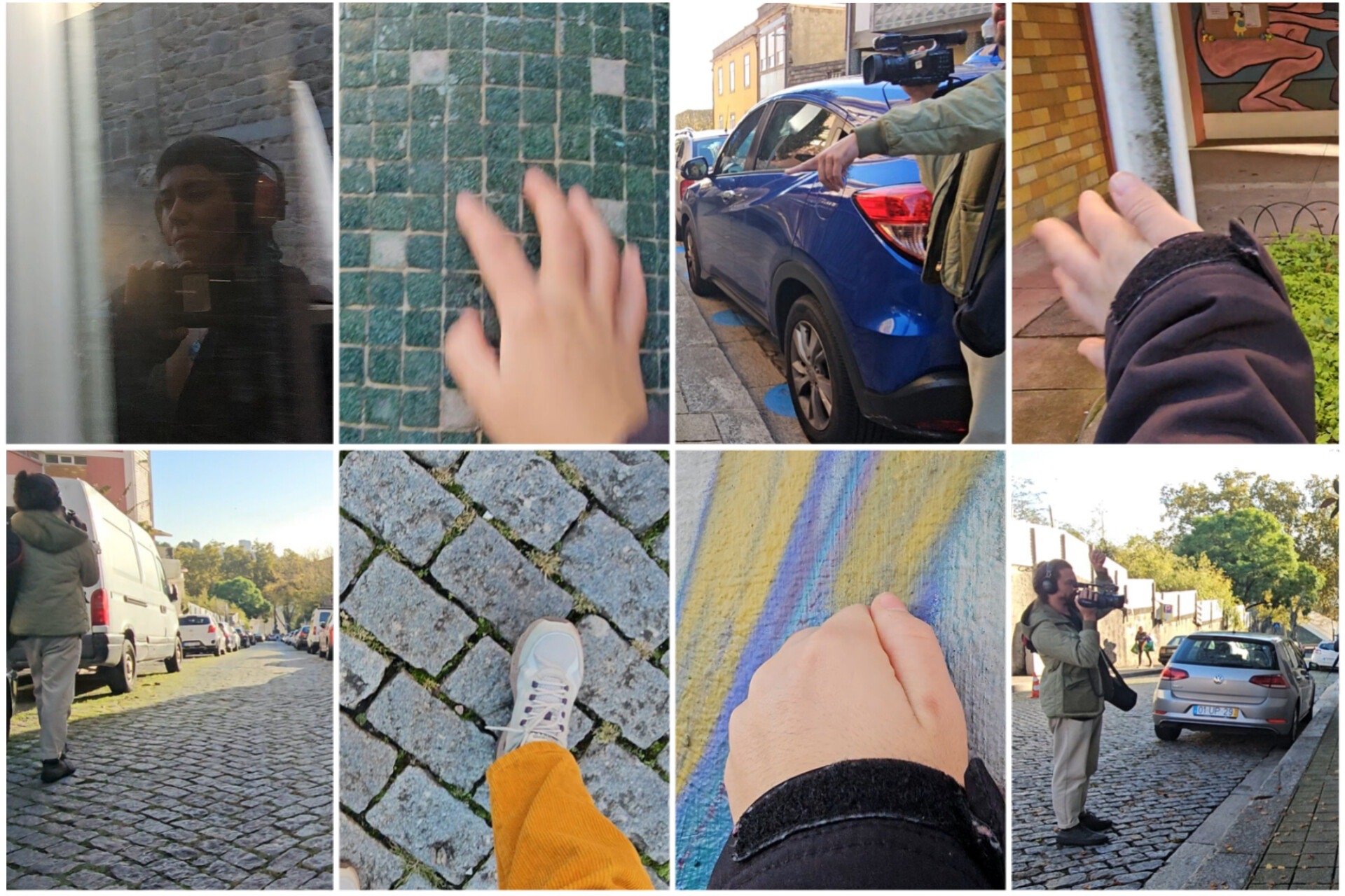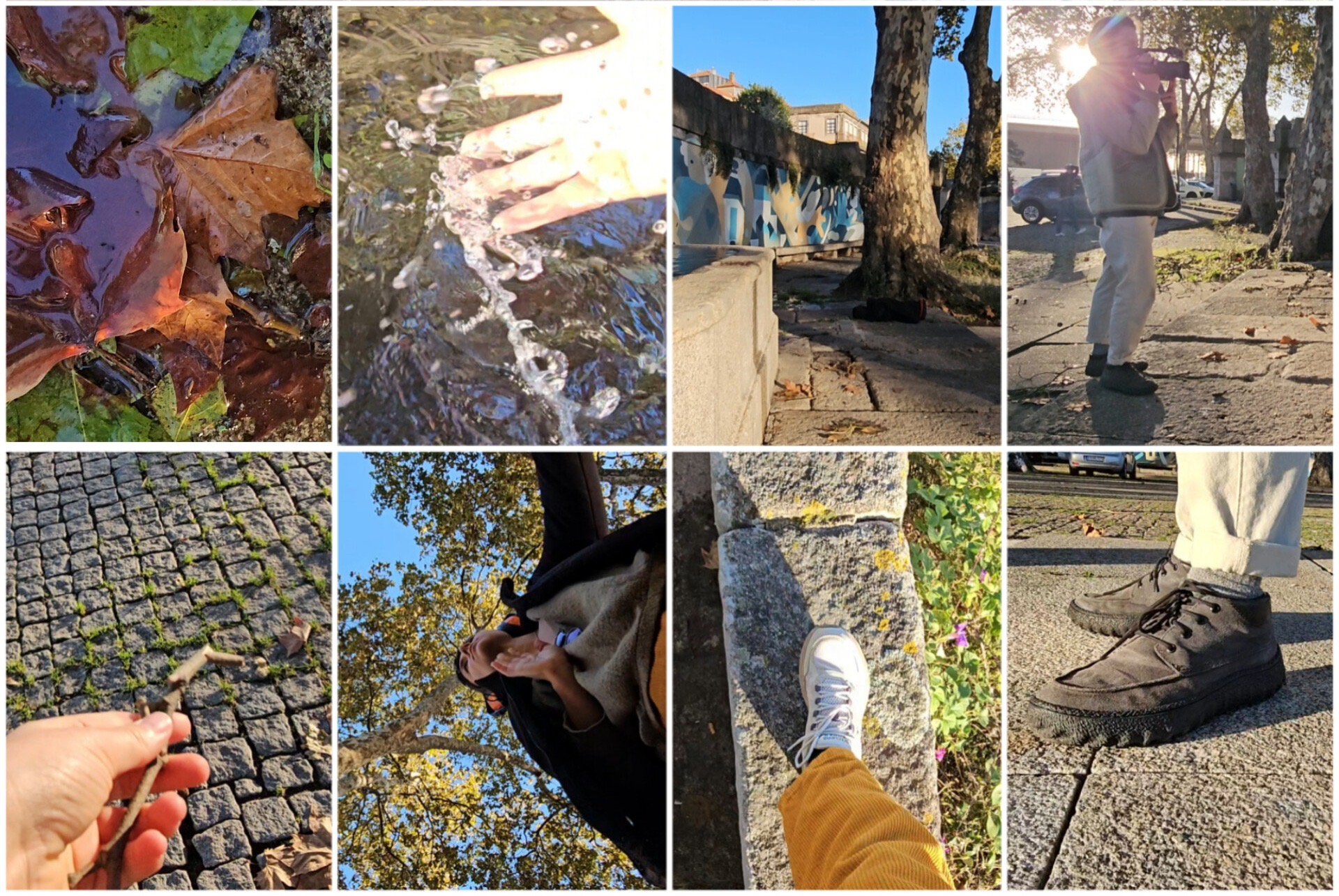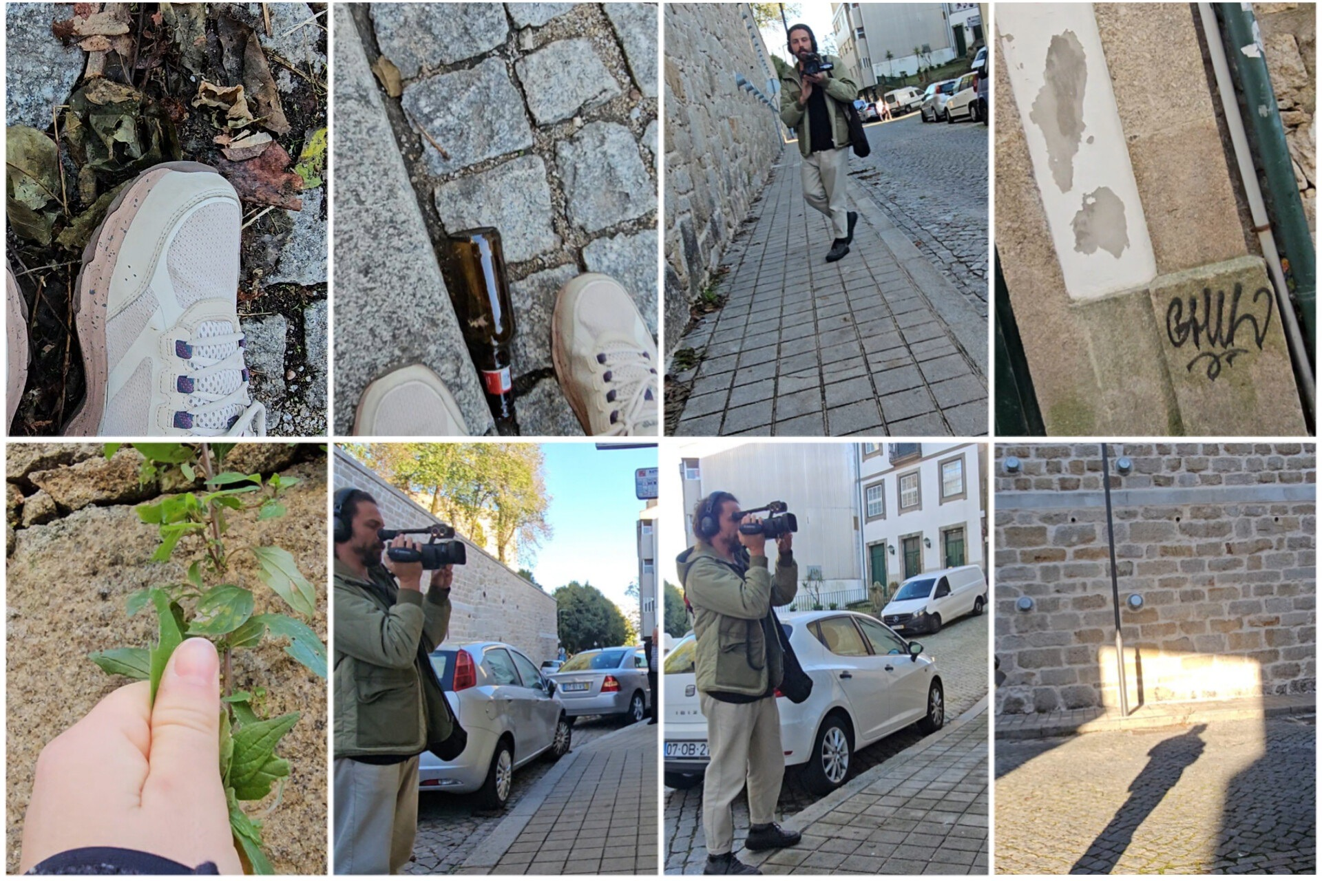 Durante o percurso, o Pedro Bitencourt trabalhou com o video, filmando alguns percursos, com planos de fundo que transmitissem texturas e cores diversas, captando a narrativa da caminhada até às Fontaínas, e planos de imagem que captassem o movimento das mãos em alguns objetos ou locais.