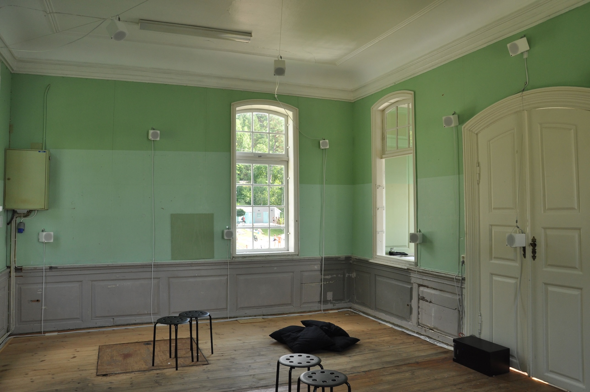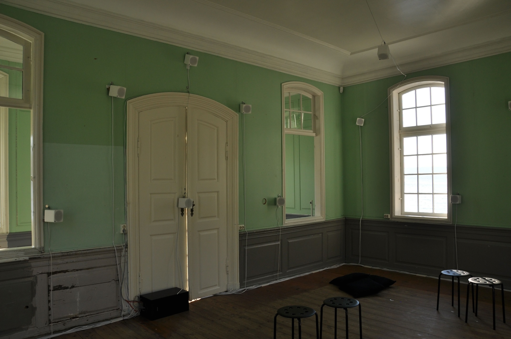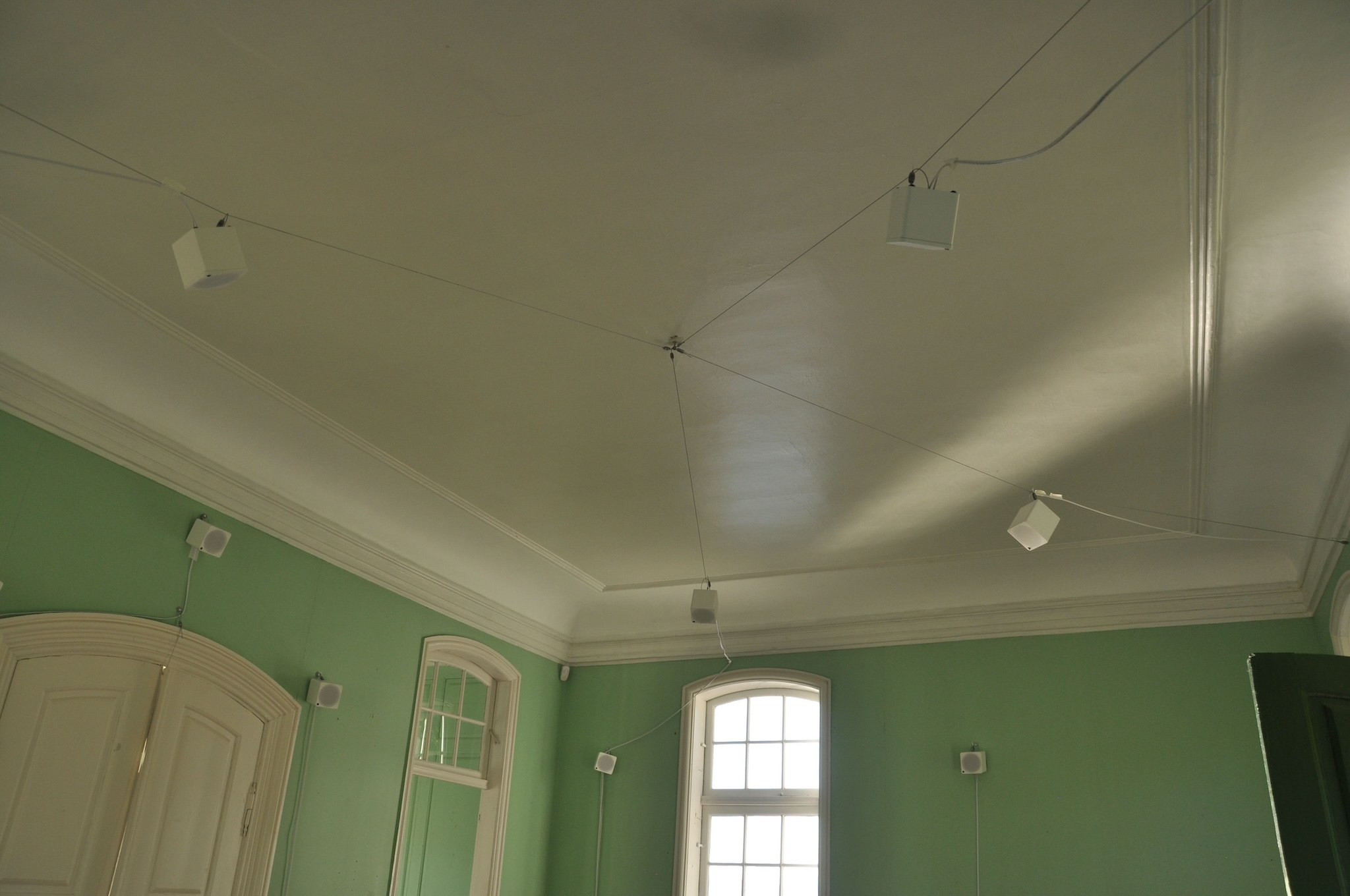 Unlike the later installations, this work was installed inside a building. Although the installation was not strictly outdoors, the age of the building meant there was no sound isolation and the outside environment easily penetrated through the walls and windows, and blended with the sounds of the installation.