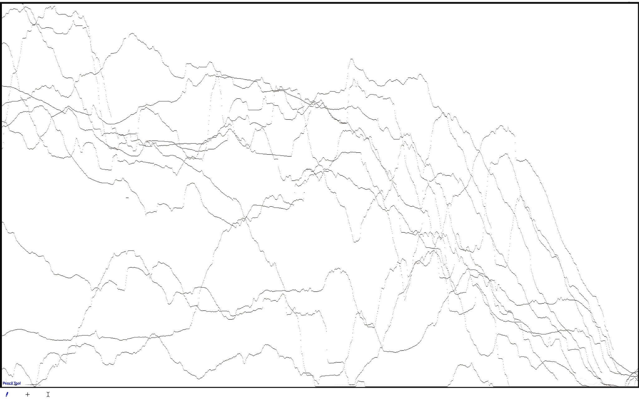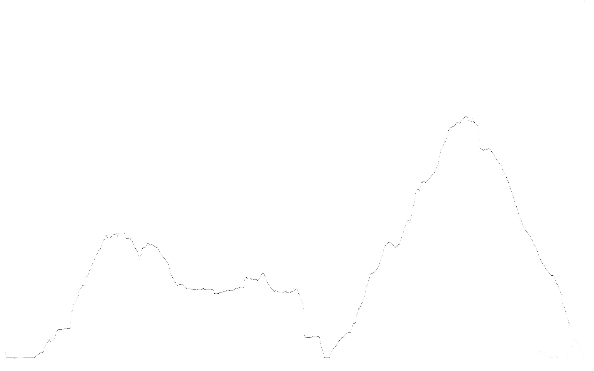 I then drew a line through the landscape from the pavilion up to each of these 10 markers. These lines produced 10 topography cross sections of the landscape with a height accuracy of 1 metre; in other words I obtained 10, 2D height maps where each increment in height is geotagged with its actual map location. The images below show one of these height maps and all 10 height maps superimposed into 2D.