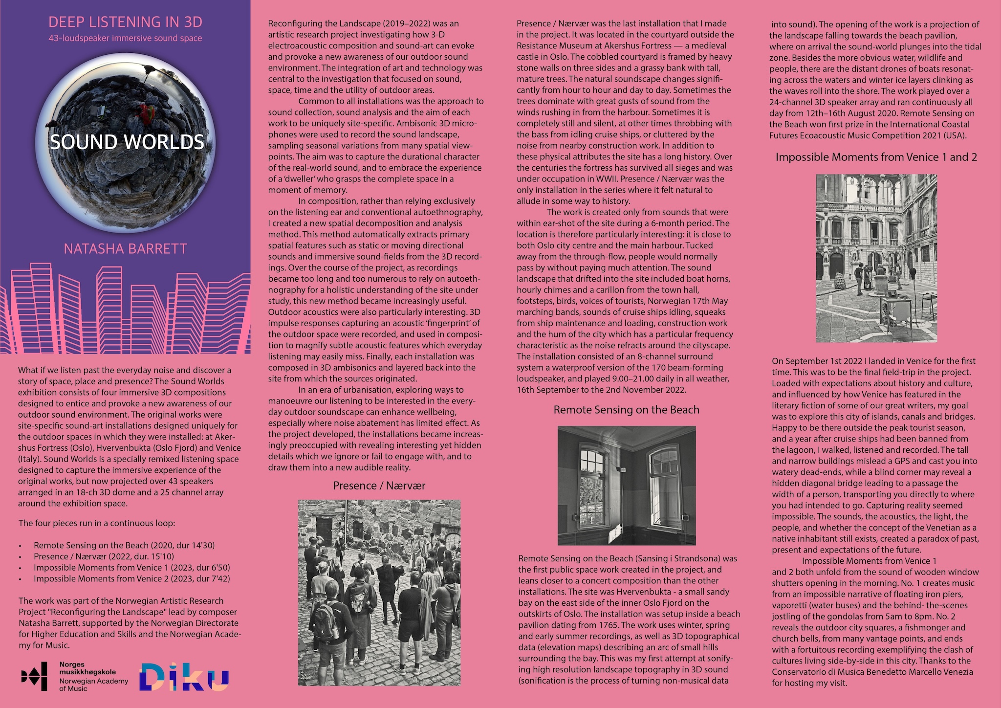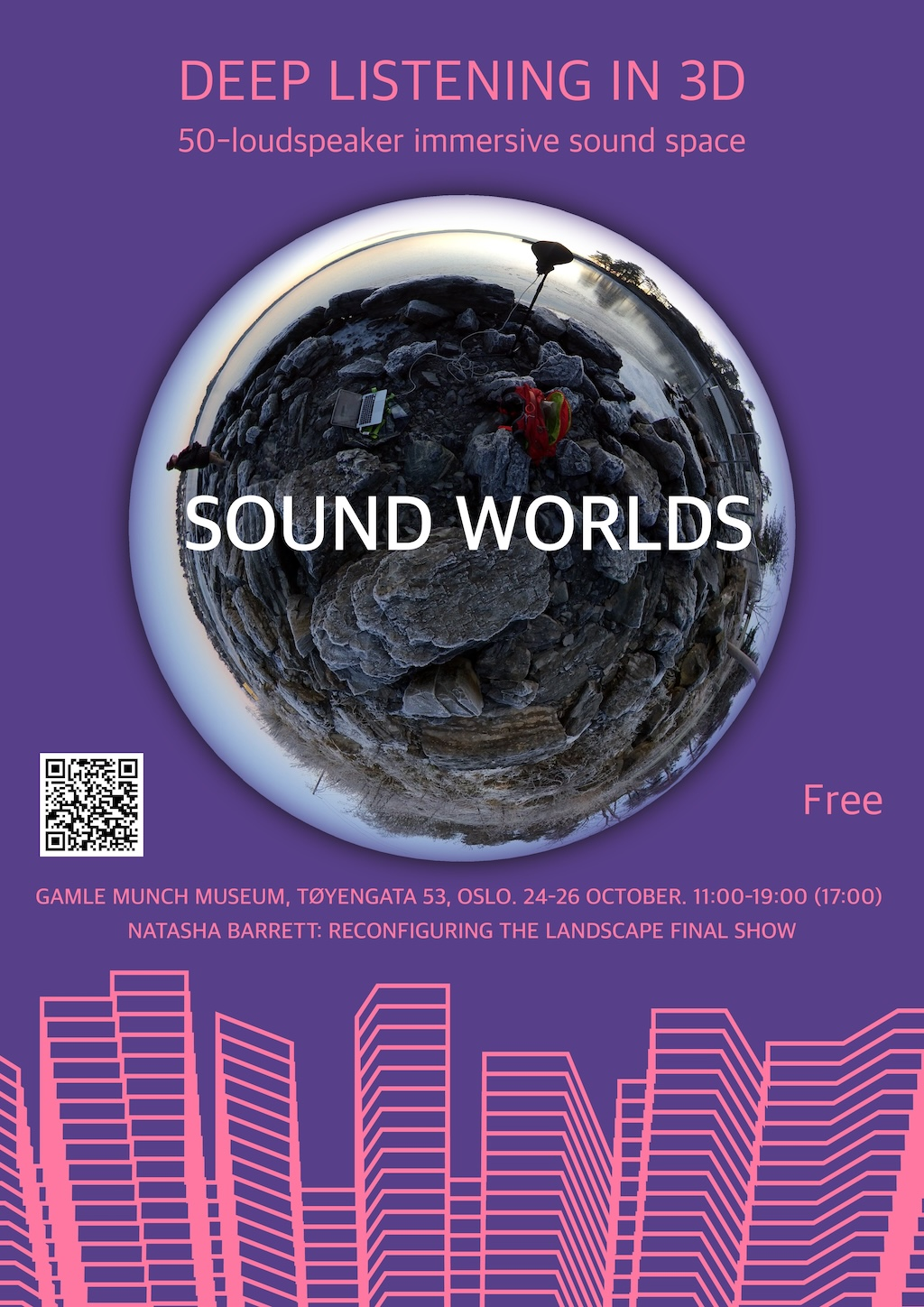 As a final conclusion to the research project, I remixed three of the five installations for an indoor exhibition space as a multi-part work called “Sound Worlds.” The sound exposition was installed in the Foredragssal at the Old Munch Museum in Oslo, which is a 21x18 meter space with a high ceiling. The exhibition was open to the public from the 24th to the 26th of October 2023.