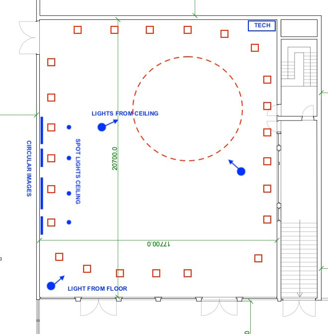 The two loudspeaker systems were set up as shown in the Foredragssalen room plan. The surround array (red squares) was a combination of Genelec 8040s and 8050s. The room acoustics consisted of some prominent early reflections and flutter echoes in higher frequencies, and a washy reverberation, quite unlike the smooth reverberation we hear from good concert hall acoustics. These acoustics resulted in a full but diffuse soundfield from the 24.1 system, which also appeared to change as you walked around the space. In contrast, the dome, which was equipped with 18 small JBL speakers, though not of the same quality as the Genelecs, created a closer and clearer soundfield. When listening inside the dome, you would, therefore, hear a superimposition of the nearfield (dome) and farfield (24.1 system). When outside of the dome, the 24.1 system dominated with a zone of sound activity in the direction of the dome.