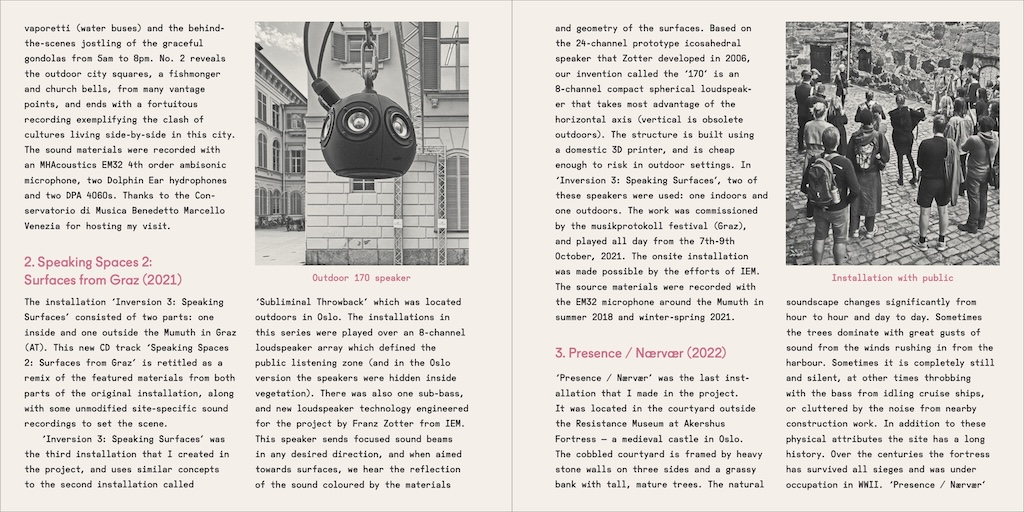 From the five outdoor sound installations four were chosen to feature on the the CD (see track listing above). In consultation with Iain Chambers, the director of the label Persistence of Sound, we decided not to include "Subliminal Throwback" as the concept was very similar to "Speaking Spaces 2: Surfaces from Graz," and the latter contained a higher density and variety of materials more suitable for out-of-context CD listening. (This higher density was due to the soundscape of the installation site being more complex.) The choice was also influenced by "Speaking Spaces 2: Surfaces from Graz" adding a non-Norwegian location to the series of pieces.