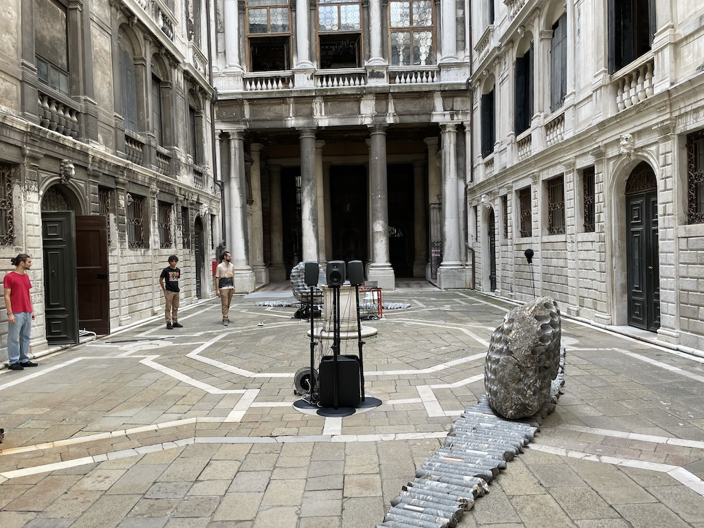 The intention was to develop a sound installation for the open outdoor courtyard of the Conservatorio di Musica Benedetto Marcello Venezia. However, despite the favorable weather during the initial part of the stay, as the event date approached, rain was forecasted. Since the we lacked weatherproof outdoor loudspeakers, the event had to be moved indoors. This change also altered my composition strategy, marking the first instance of relocating a work originally intended for a different site. Although the research, technical and artistic approach remained consistent with my previous installation projects, the approach to temporal structure shifted more towards that of concert composition.