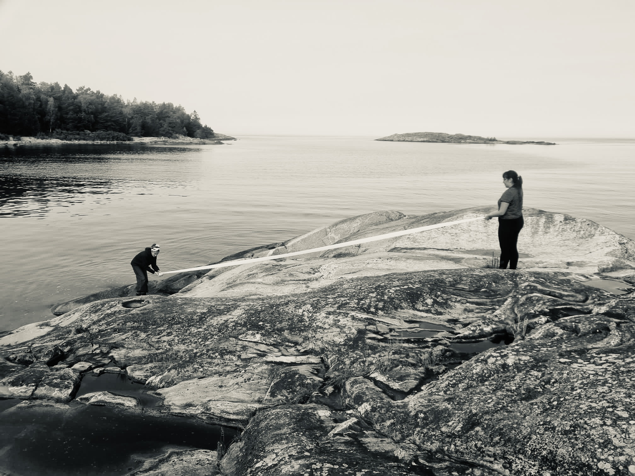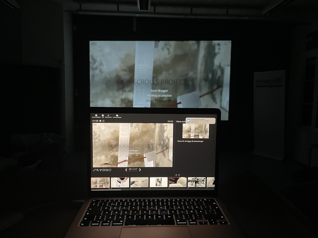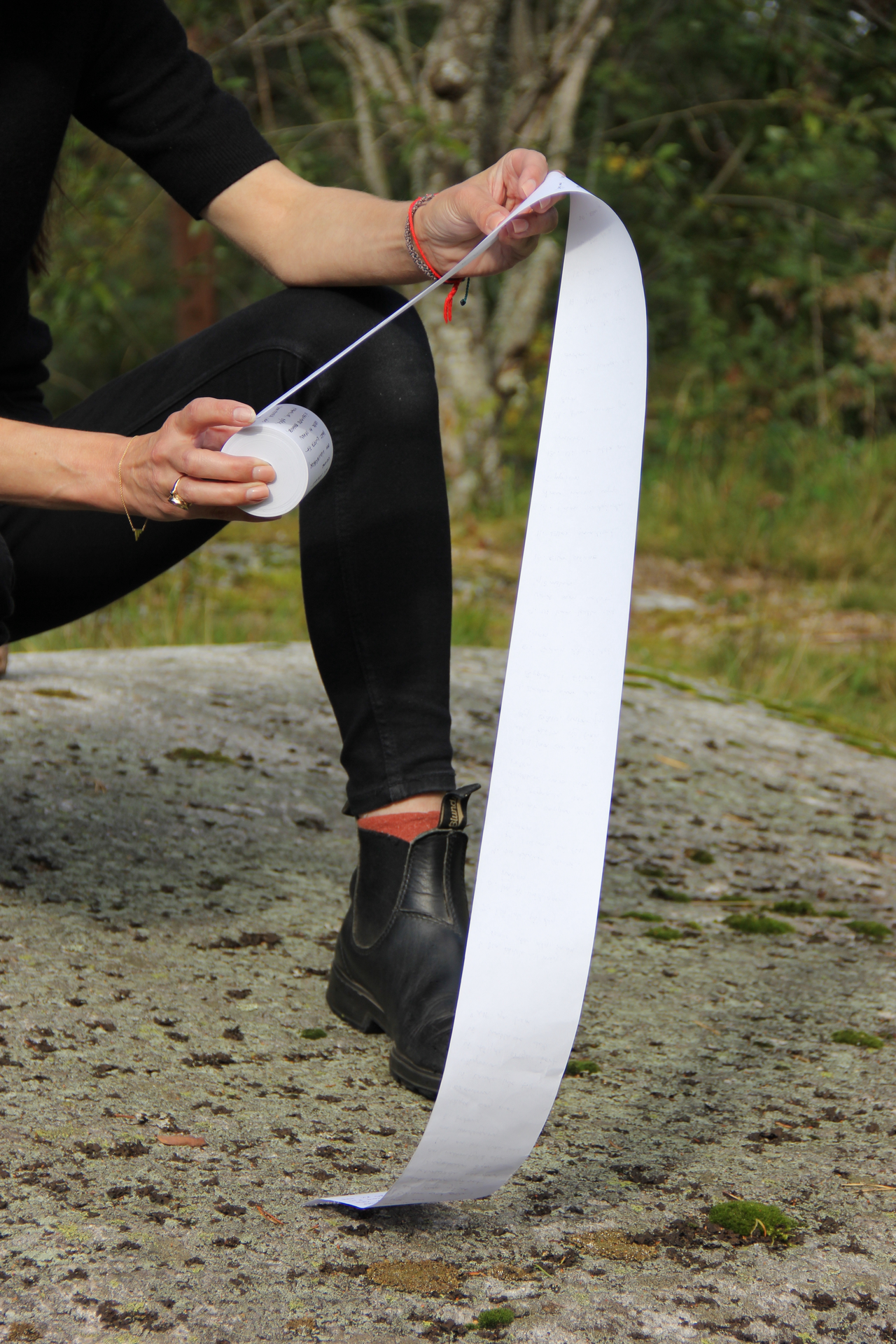 The photos depict my fellow artists at the residency writing a testimony on the scrolls I brought, a testimony of us being just there, at that particular moment. To do so was an unexpected activity stemmed from the talk that evolved as we walked; a talk on place, traces and testimony and women's testimonies throughout history. How does women take place in the landscape, how do we leave traces, how do we show our presence?