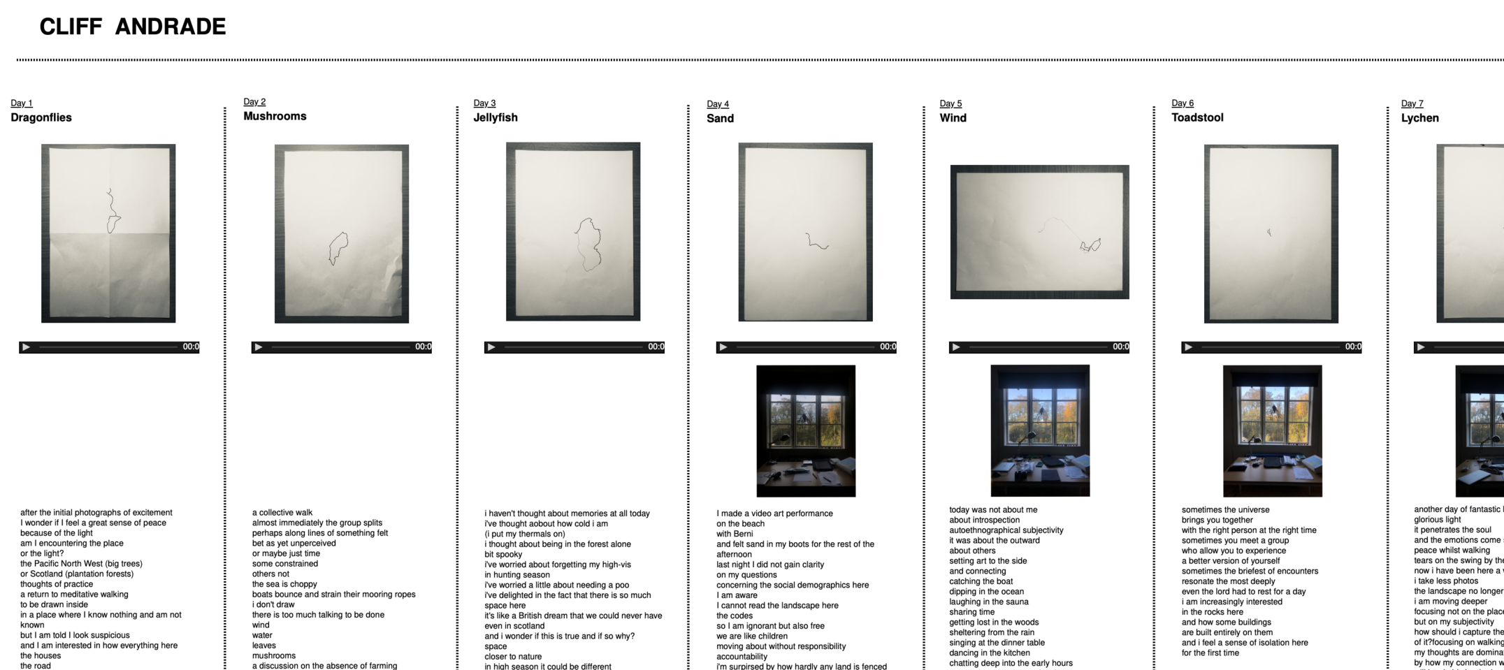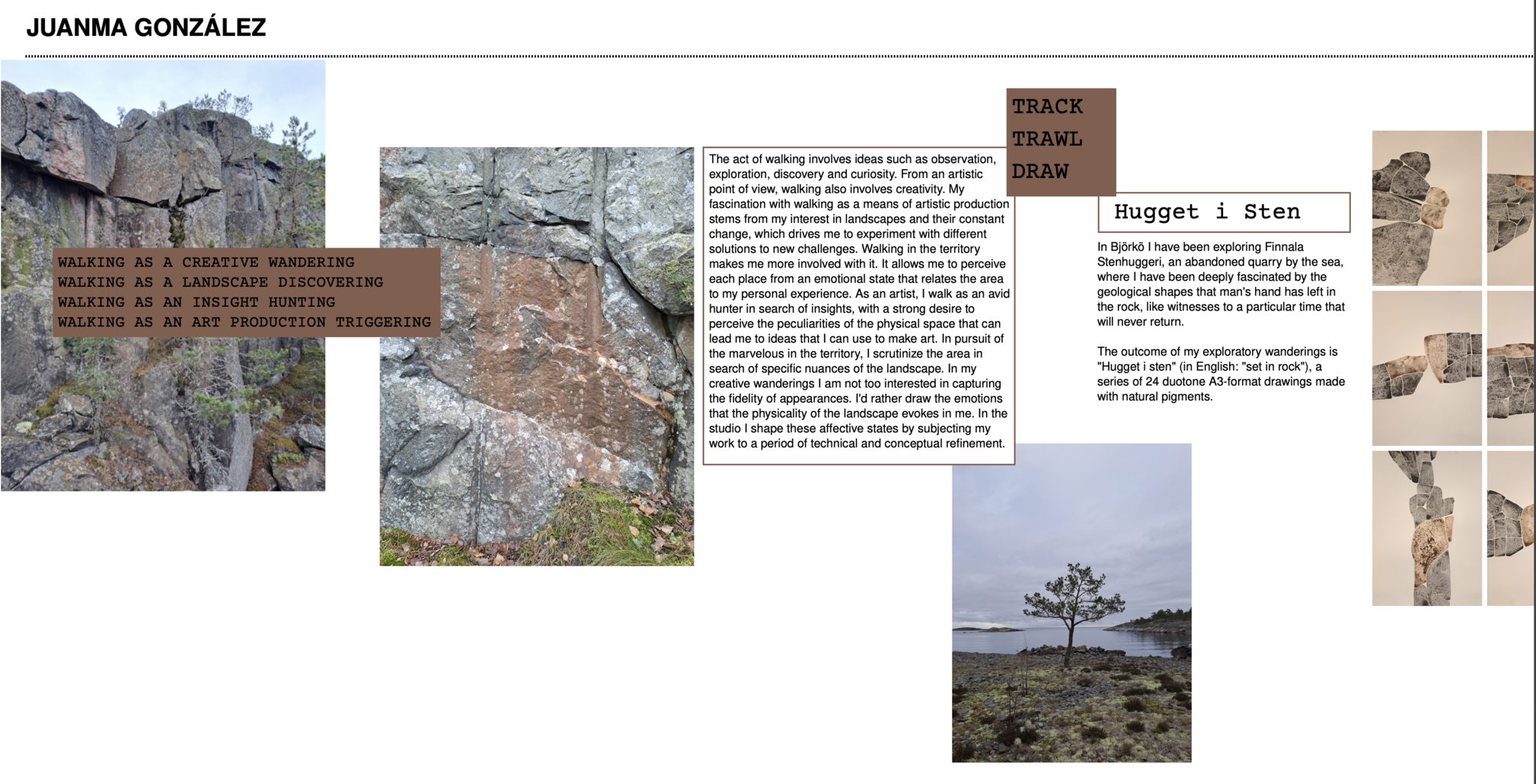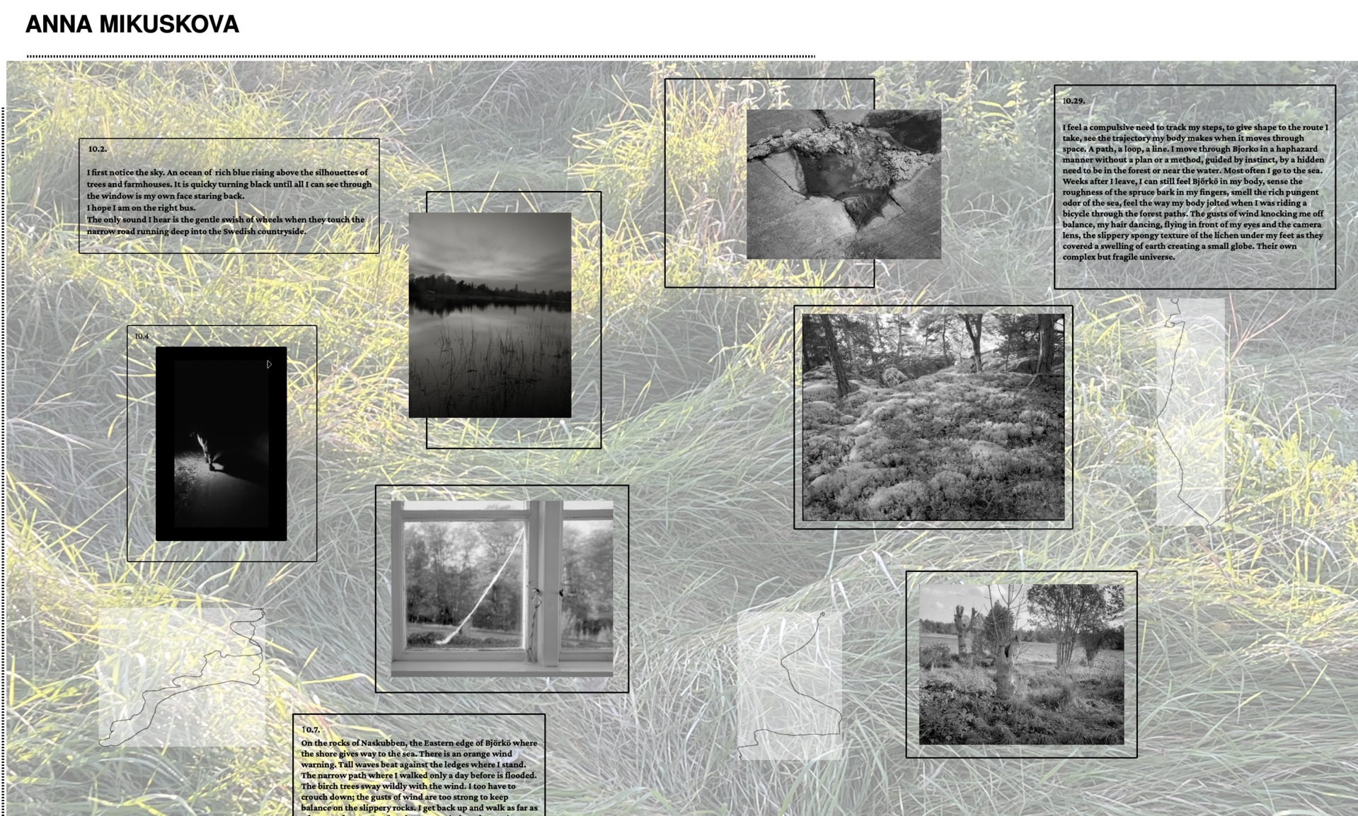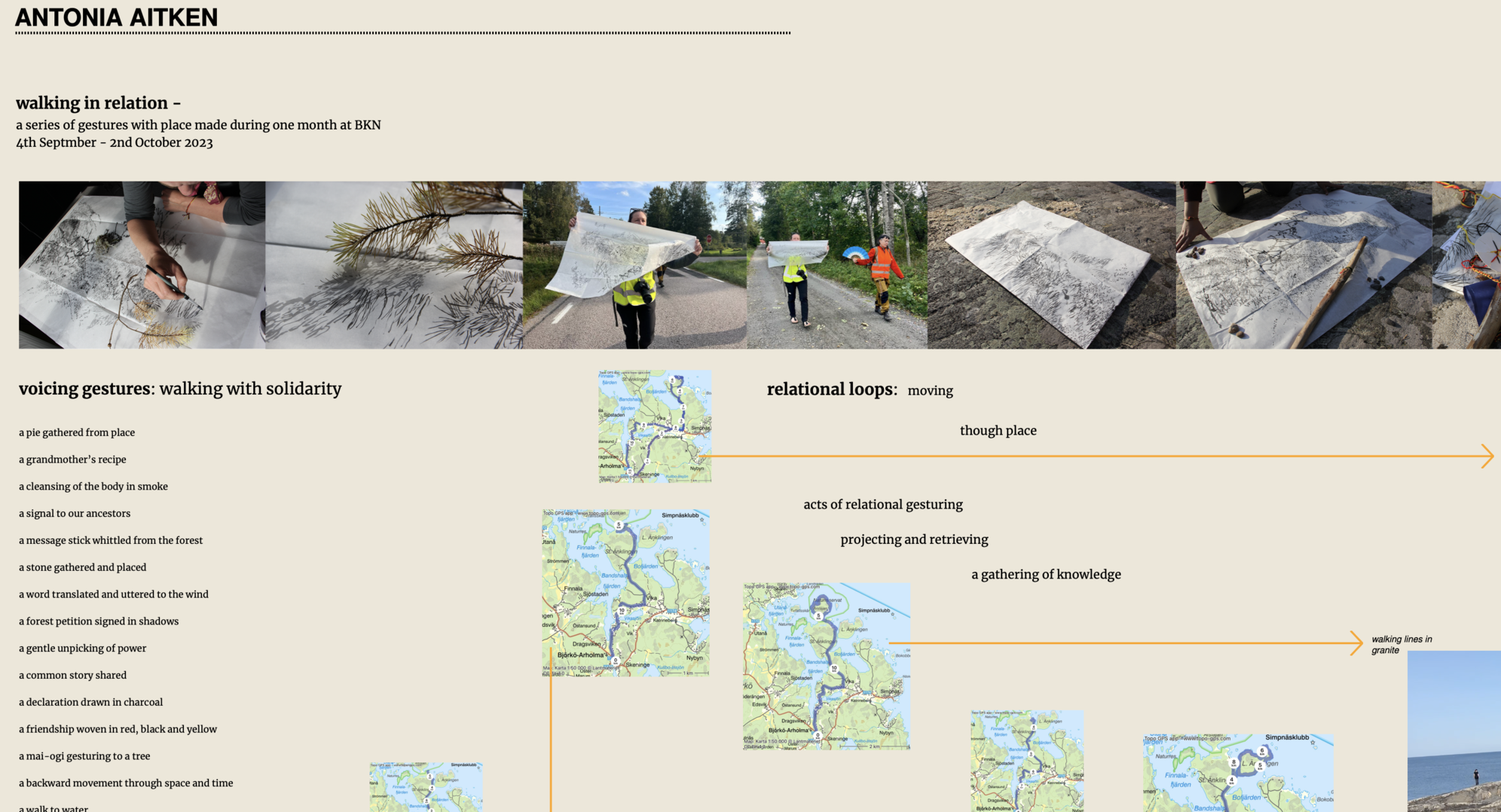WALKING AS PRACTICE WAP23 was a process-based residency during September-November 2023, where artists using walking as a method delved into each others’ knowledges and things they encountered together at BKN, the Northern Stockholm Archipelago in Sweden. Fieldworks, share sessions and seminars were created jointly to locate and entangle structures, narratives and themes for walking. The residency formed a transformative, dynamic space for art that engaged with life and nature towards critical and poetic explorations, influenced by the immediate surroundings: the forest, lakes, sea and people living in the rural area. Processing how walking is interlocked in our artistic practices, this exposition represents a gathering of texts, visuals and audio from the walking art residency. The selected artists contributed with interdisciplinary practices, primarily drawing, photography, video, performance and dance. They worked both individually, in spontaneous constellations and in group sessions. The dissemination of the program took place in share sessions upon arrival of new artists - including dinners, open studios, walks, workshops etc. In addition, as the program unfolded, each artist developed their own exposition.