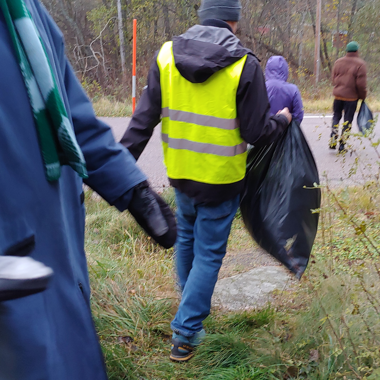Put on a reflective vest. Grab a bag from the kitchen or outside. Or just be a companion. Walk 600 meters along the road past the church to the dumpsters. Talk and laugh a lot on the way. Empty bags into the correct dumpsters. Don’t worry if milk gets on the dumpster. The rain, the rain, will wash it away. Walk back, imitating the things along the side of the road, laughing and talking.
