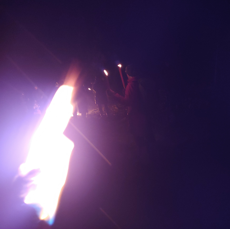 Obtain an extremely well-made torch, that is a thick wooden dowel, wrapped (maybe?) in sheets of paraffin. Light it from a candle on the ground, then line up three-abreast and walk about 20-30 minutes as a group of at least 44 people with torches burning, through a path in the forest to the quarry. At the quarry, cook sausages over open fires. Notice how large and bright the full moon is over the sea. After the crowd dies down, drink hot tea from a thermos and add whiskey to it. Walk back home by just the moonlight. Take a shortcut through the forest.