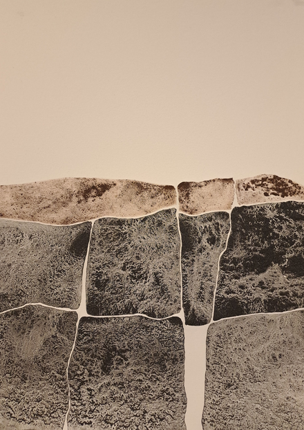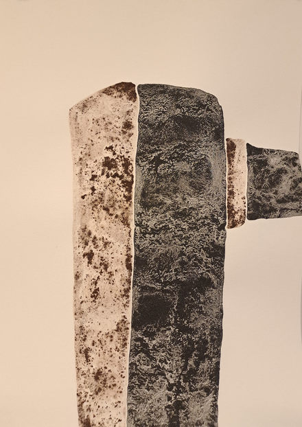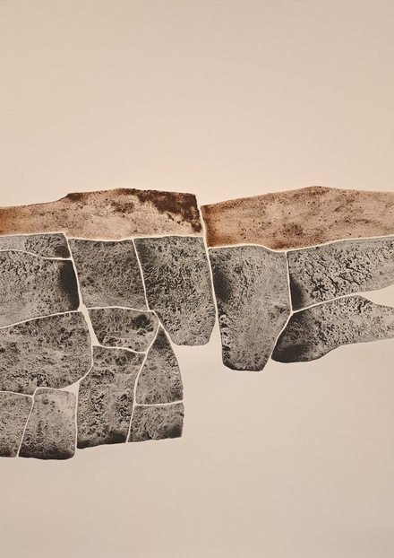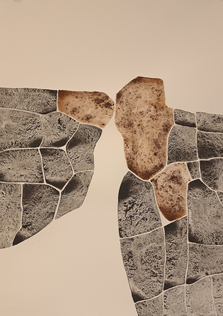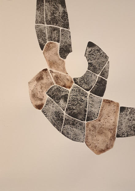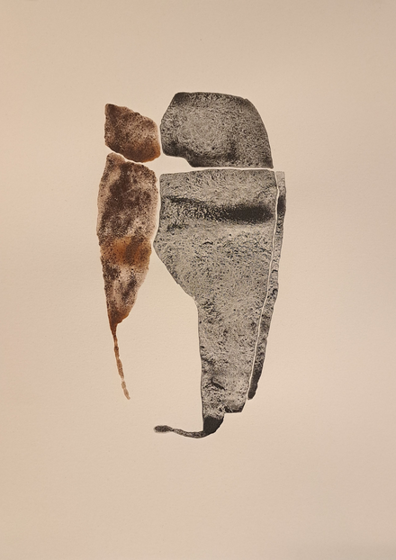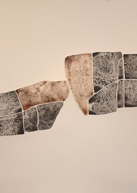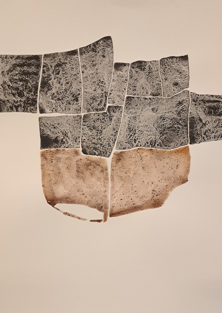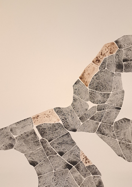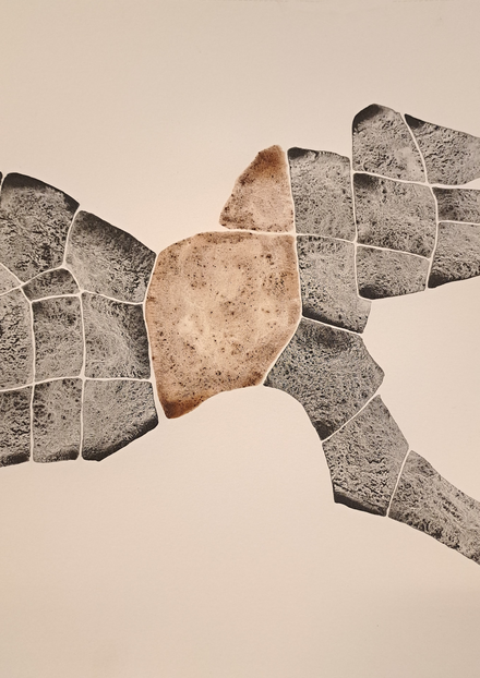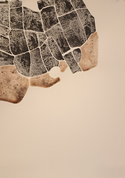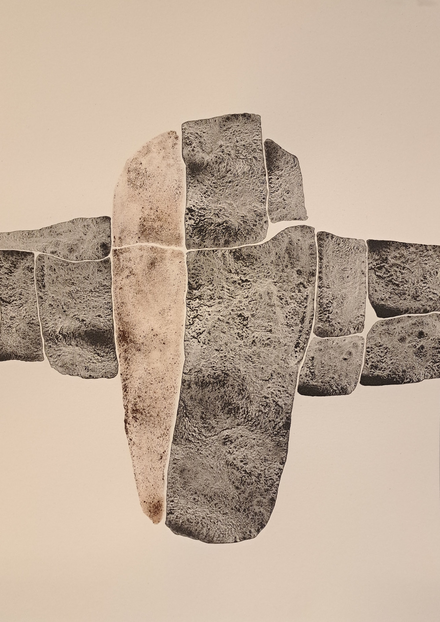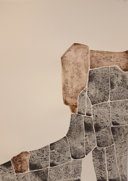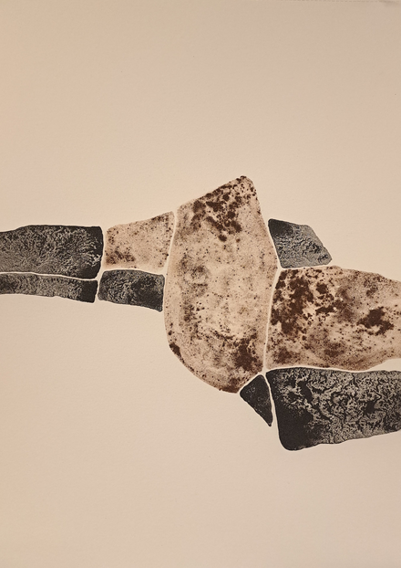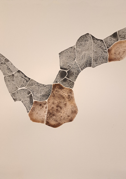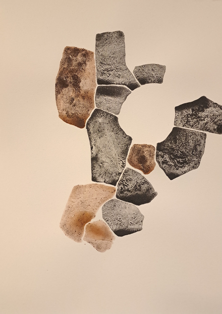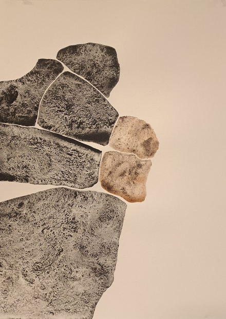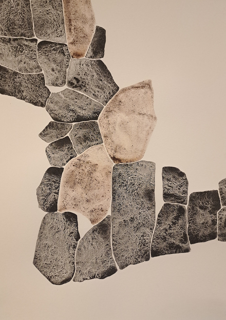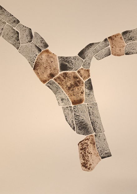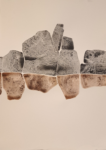 The outcome of my exploratory wanderings is "Hugget i sten" (in English: "set in rock"), a series of 24 duotone A3-format drawings made with natural pigments.