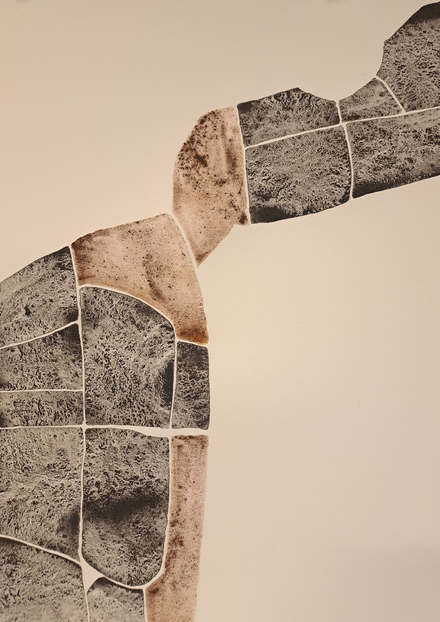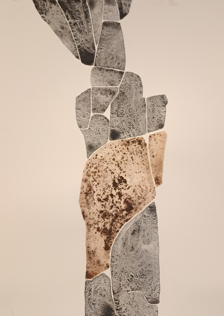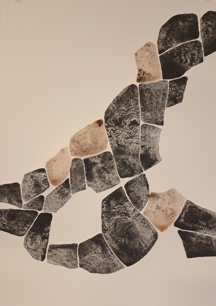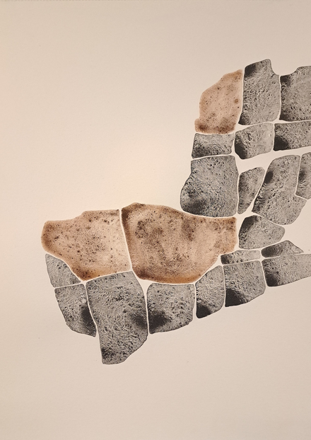 The outcome of my exploratory wanderings is "Hugget i sten" (in English: "set in rock"), a series of 24 duotone A3-format drawings made with natural pigments.