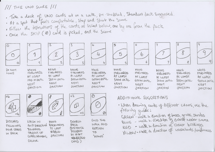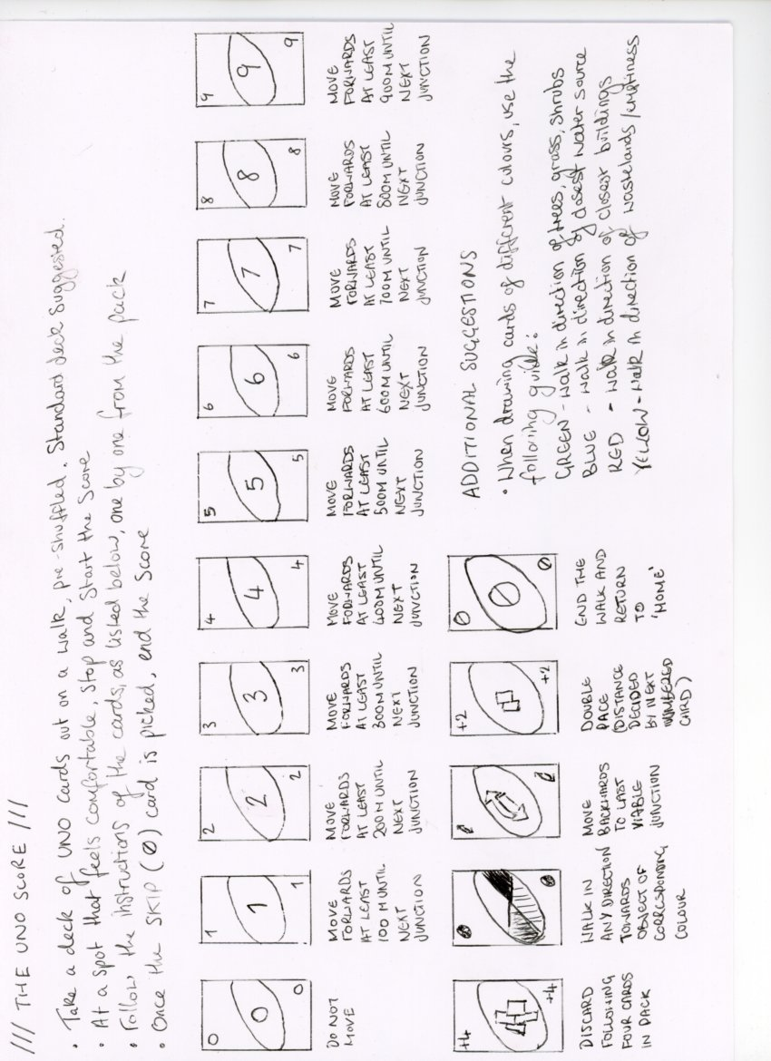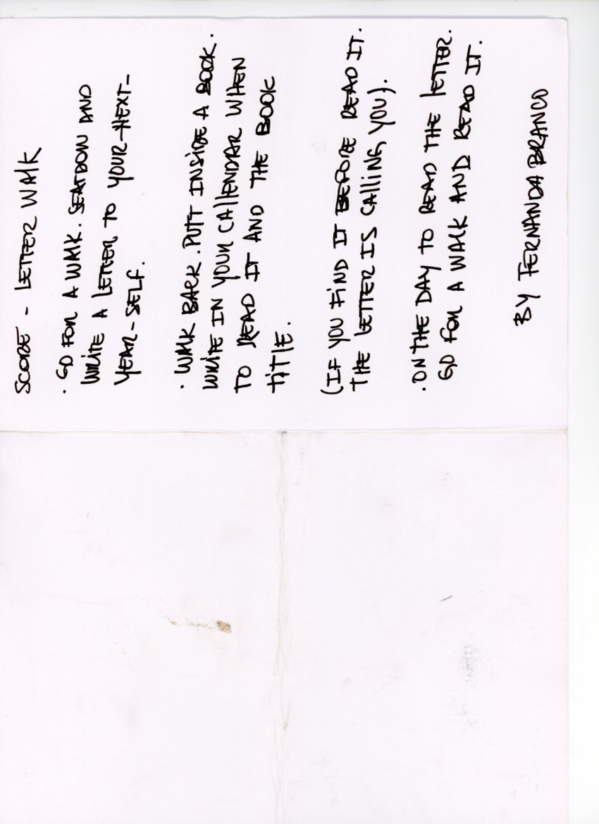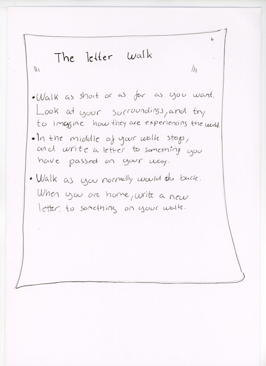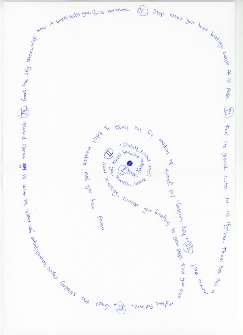 Walking scores are tools for art, composition, choreography, and for being present in urban and other spaces. Walking scores explore the relationship between art and the everyday, helping us to relate to eachother and to space, helping us to listen in various environments and reflect on the border between the artist and the audiences. It helps us to read and rewrite space.