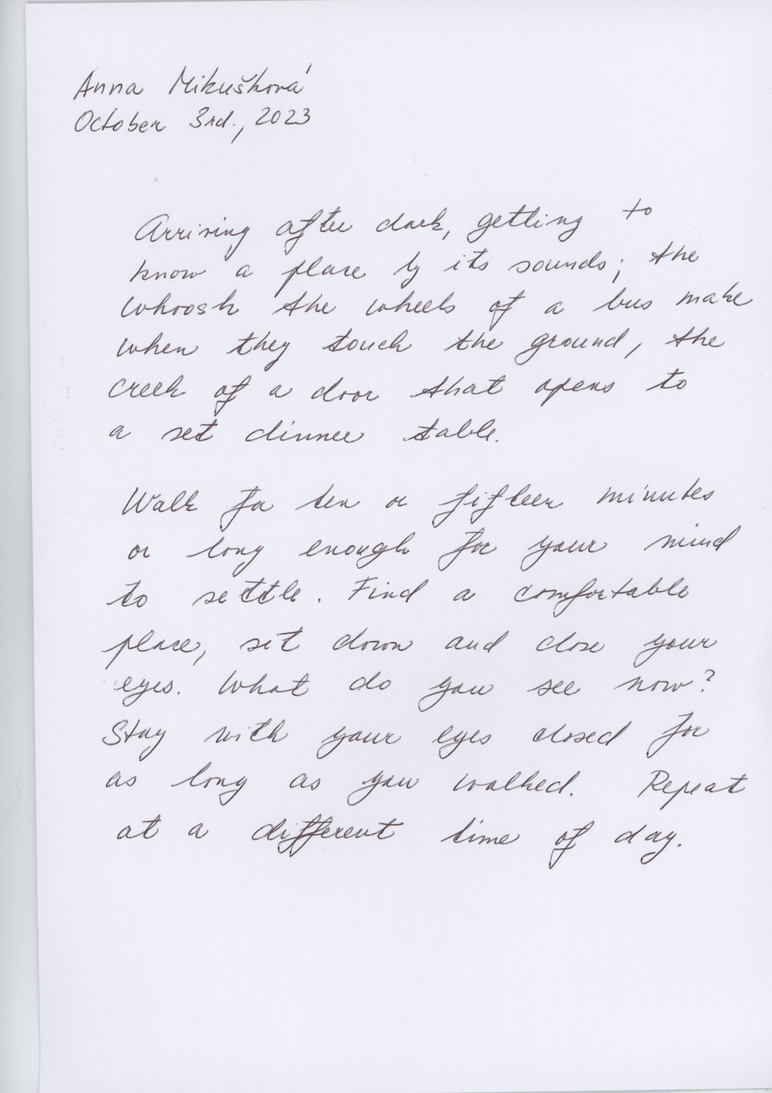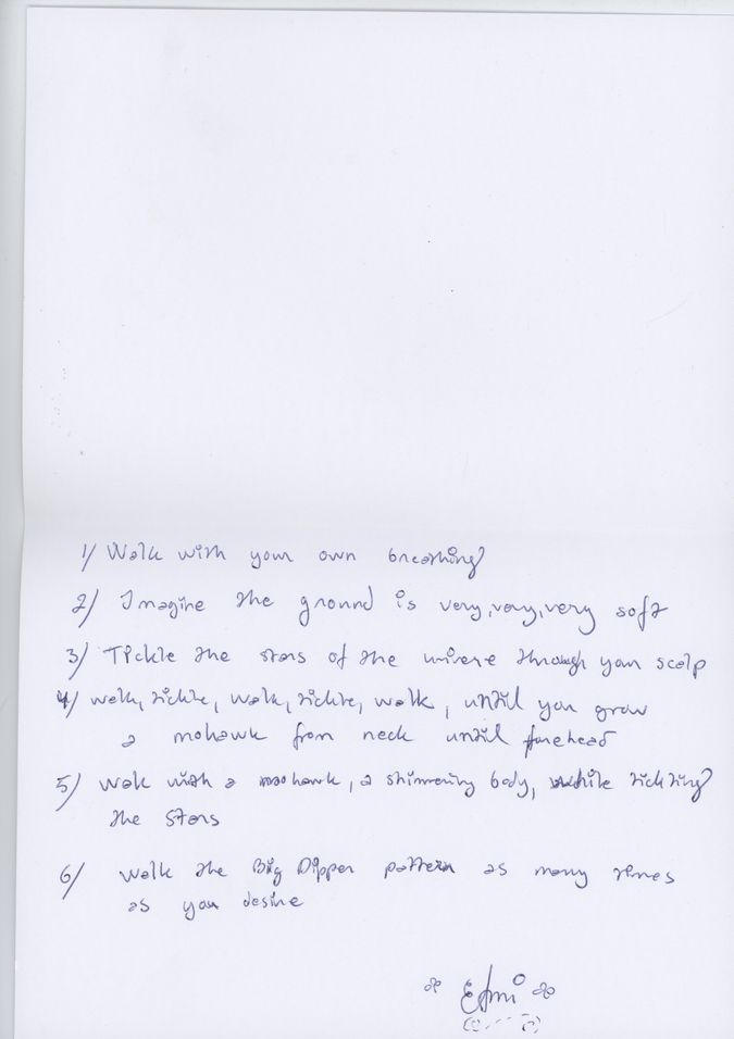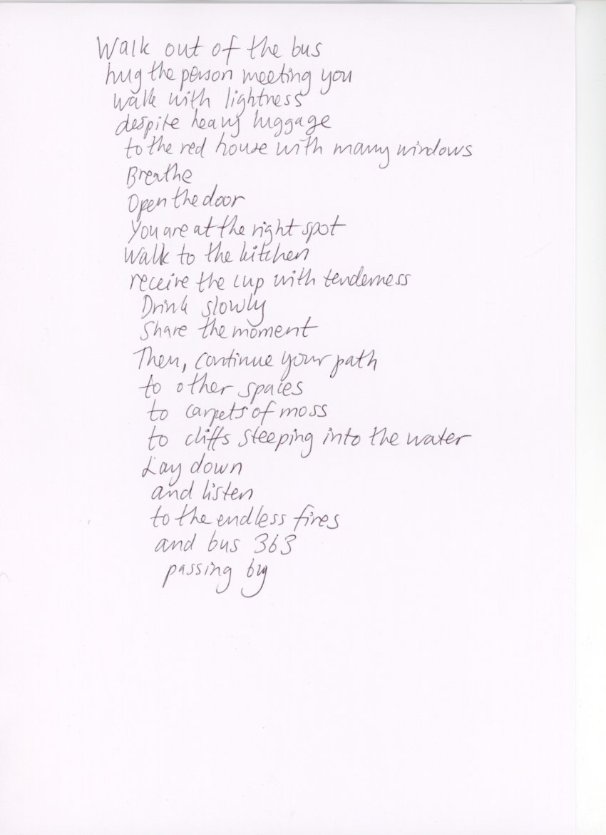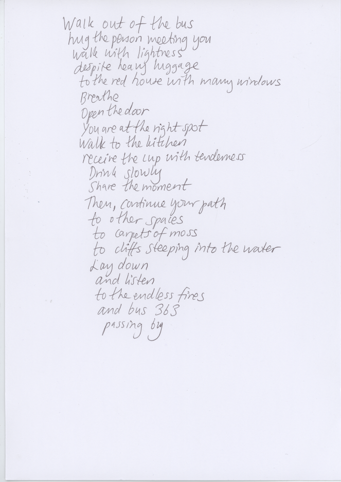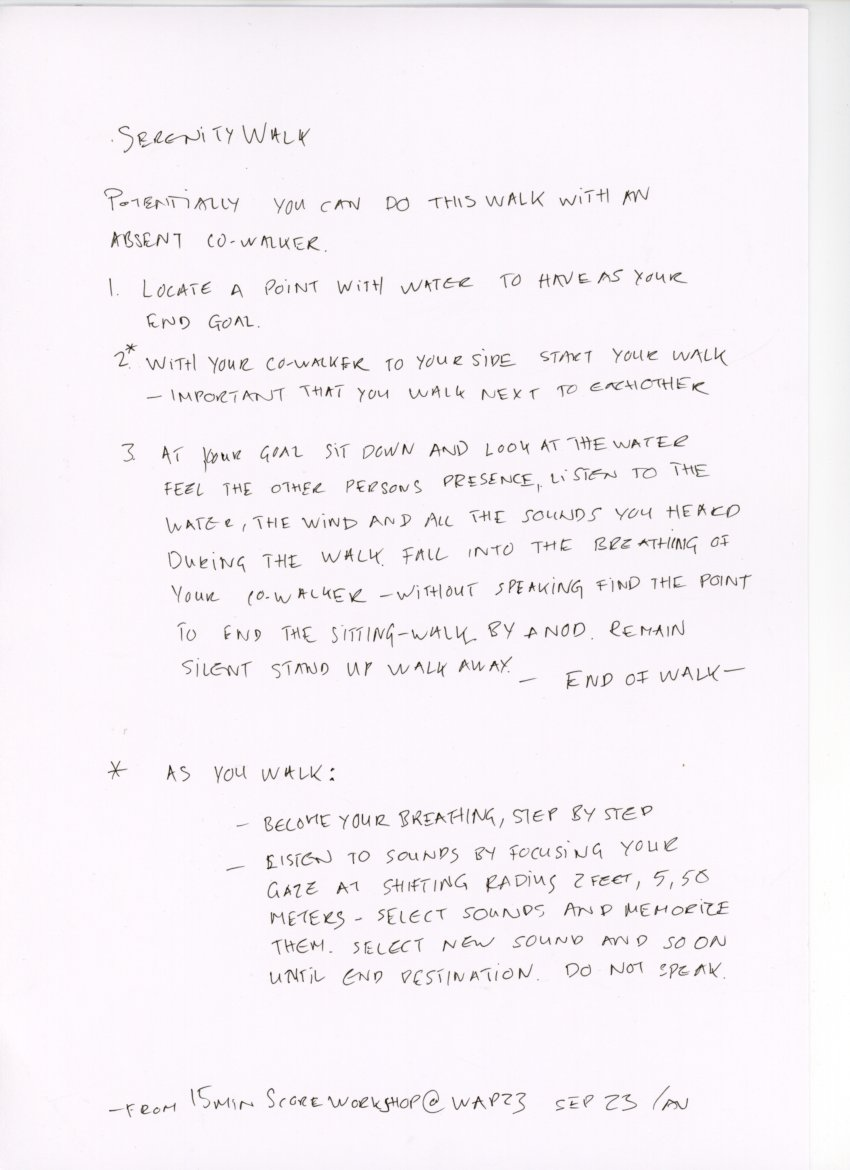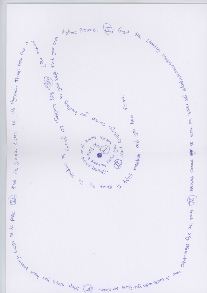 For WAP, the curators shared some historical 1960s walking scores by Anna and Lawrence Halprin, Yoko Ono and other Fluxus members. We then made 15 min-workshops to encourage each artist to formulate their own walking score with pen/pencil and a blank paper as tools. Other scores were made post residency. You find some of them here on this page. Please try them!