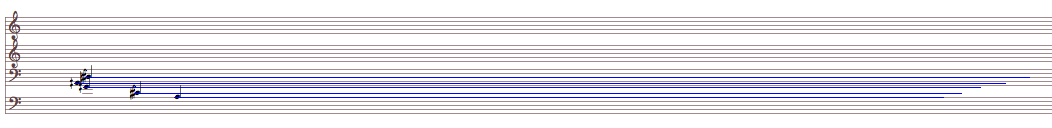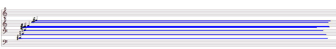 - A random chord note is transposed down and used as a virtual fundamental for overtone series spanning through the whole register,[9] used as a new pitch grid for the now strongly distorted tam-tam spectrum.[10] Floating number interval multiplications already applied can make the spectrum more harsh, artificial and less resonant. A harmonic series as intonation can bring back resonant qualities to the resulting sound.