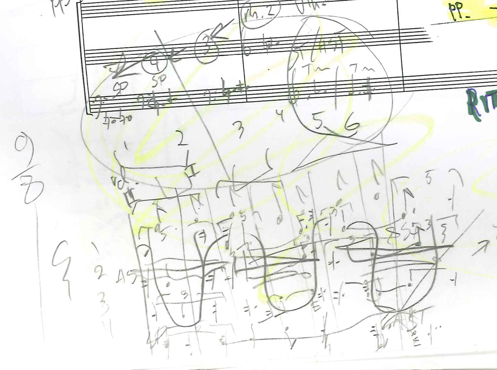 Envelopes of attack and decay sculpt these spectral orchestral masses. I have done this on paper in past pieces. This a sketch for a detail of the piece Circles (2006), showing visual shapes with approximation to rhythms.