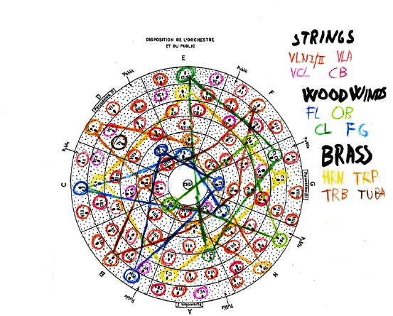 In search for spatializations within instrumental music, the atomizing approach in Nomos Gamma and Terretektorh by Xenakis struck me as the most relevant for my ideas. If we add colours to the seating plan for Terretektorh,[2] it is clear how each timbre type is spread as far as possible around the audience. There are triangles of flutes, oboes, clarinets, bassoons, and squares of horns, trumpets and trombones. The strings form more continous spatial constellations, and when all musicians play the same percussion instruments, there are no timbral differences, just space.
