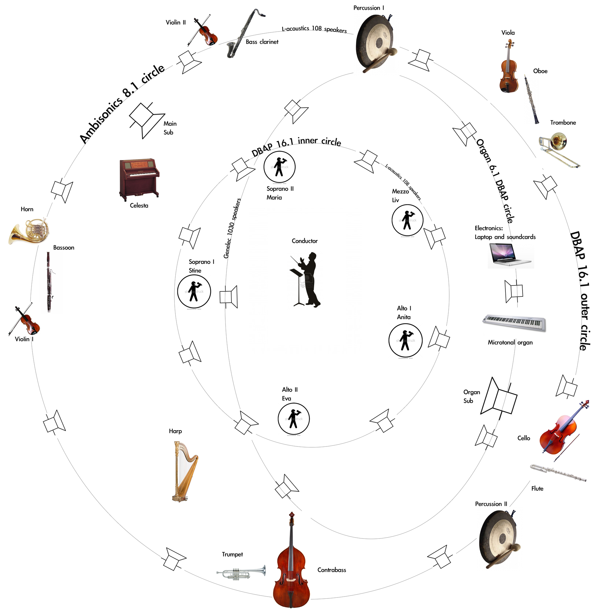 A central interest in the project was finding spatial distributions and perspective both through diffusion of electroacoustic sound and by how musicians are seated.