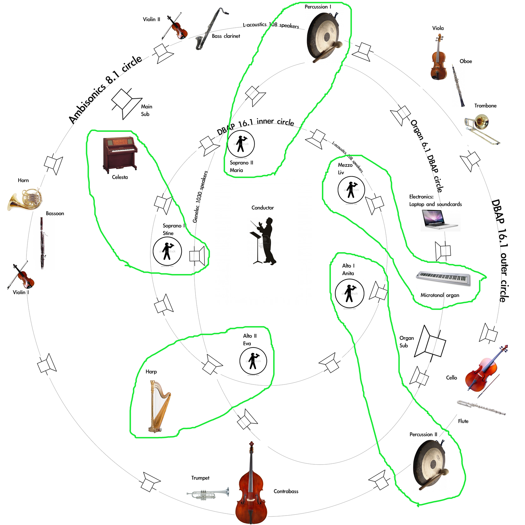 The ensemble setup works like a map for the antiphonal fragments. Through Antiphonal duos, each singer is accompanied by a nearby musician. 5 duos have fixed roles: