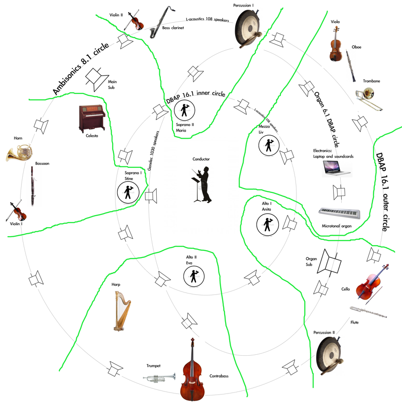 - An irregular sawtooth curve with up to 4 full rotations through the room trigger entrances for the 5 singers. Moderate curves create audible spatial paths, while steep curves blur spatial positions into an overall polyphony.