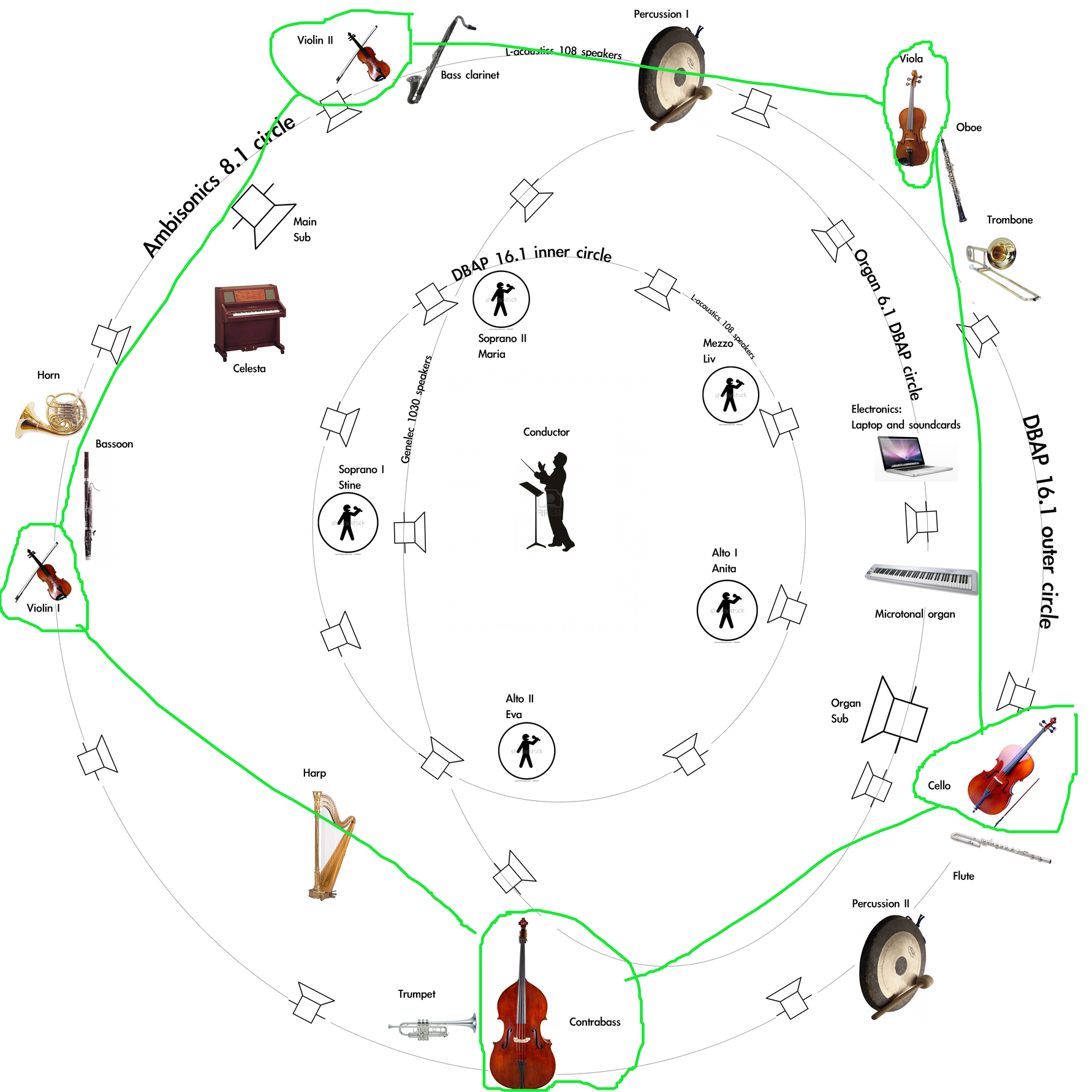 The first two noise circles are composed on top of two existing Gamelan Ravel fragments from the sound installation. Voices and strings form the most complete inner and outer circles within the setup.