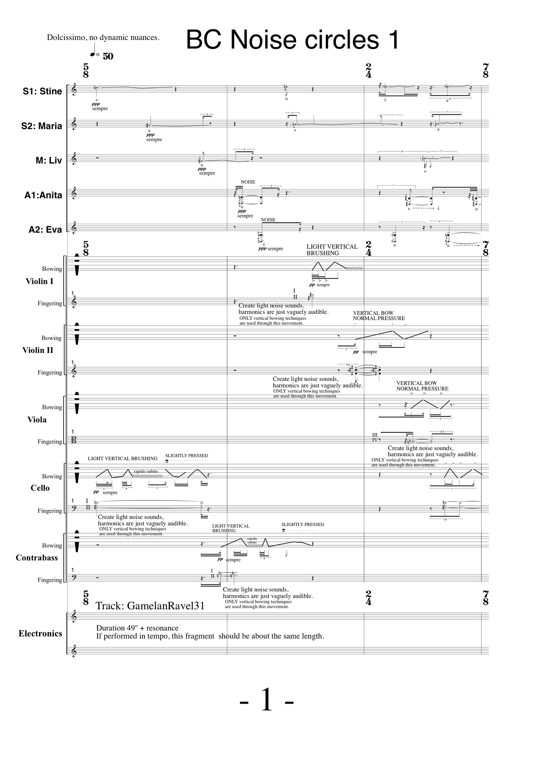 Roles are inverted; electronics have the most pitched elements, while live voices move through nuances of noise. For the strings, the Noise circles are like etudes of multidimensional performance, with the bridge clef also used by Helmut Lachenmann.[1] Polyphonies of playing techniques on a single instrument have been taken to larger extremes by Klaus K. Hübler. The bridge clef was chosen as the visually most clear notation for the Noise circles.