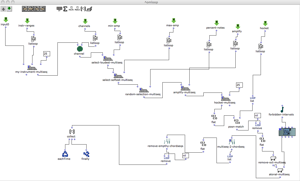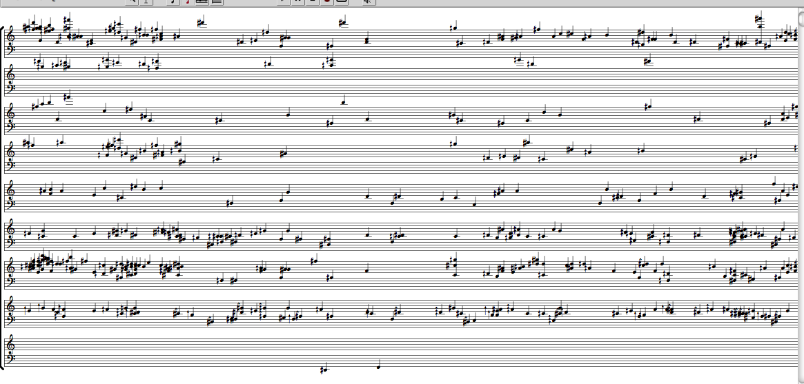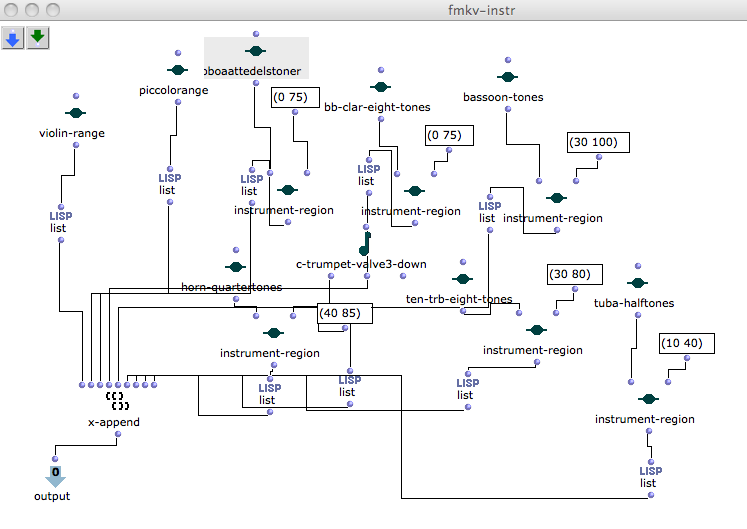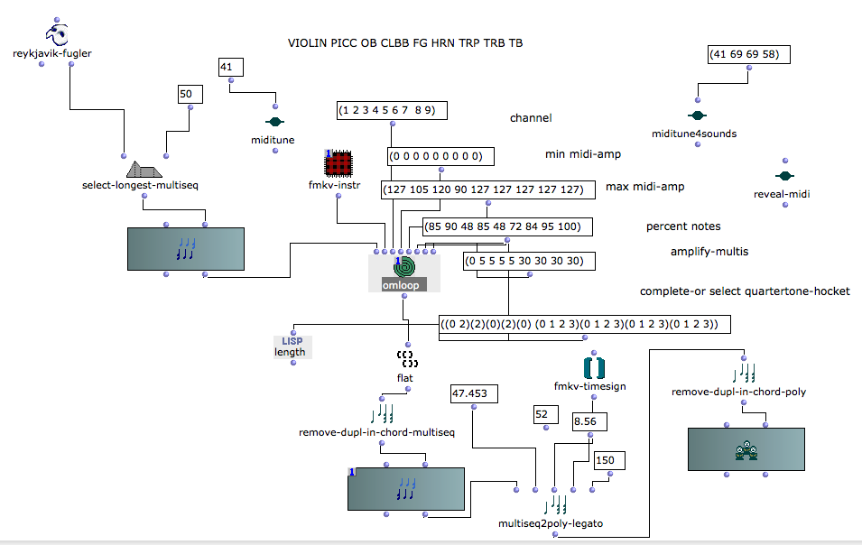 The result is a heterophony of nine instrumental parts. Unisons will happen, while the parts all follow different paths through analyzed sound events, by instrumental range, random selection, filters and microtonal hockets.