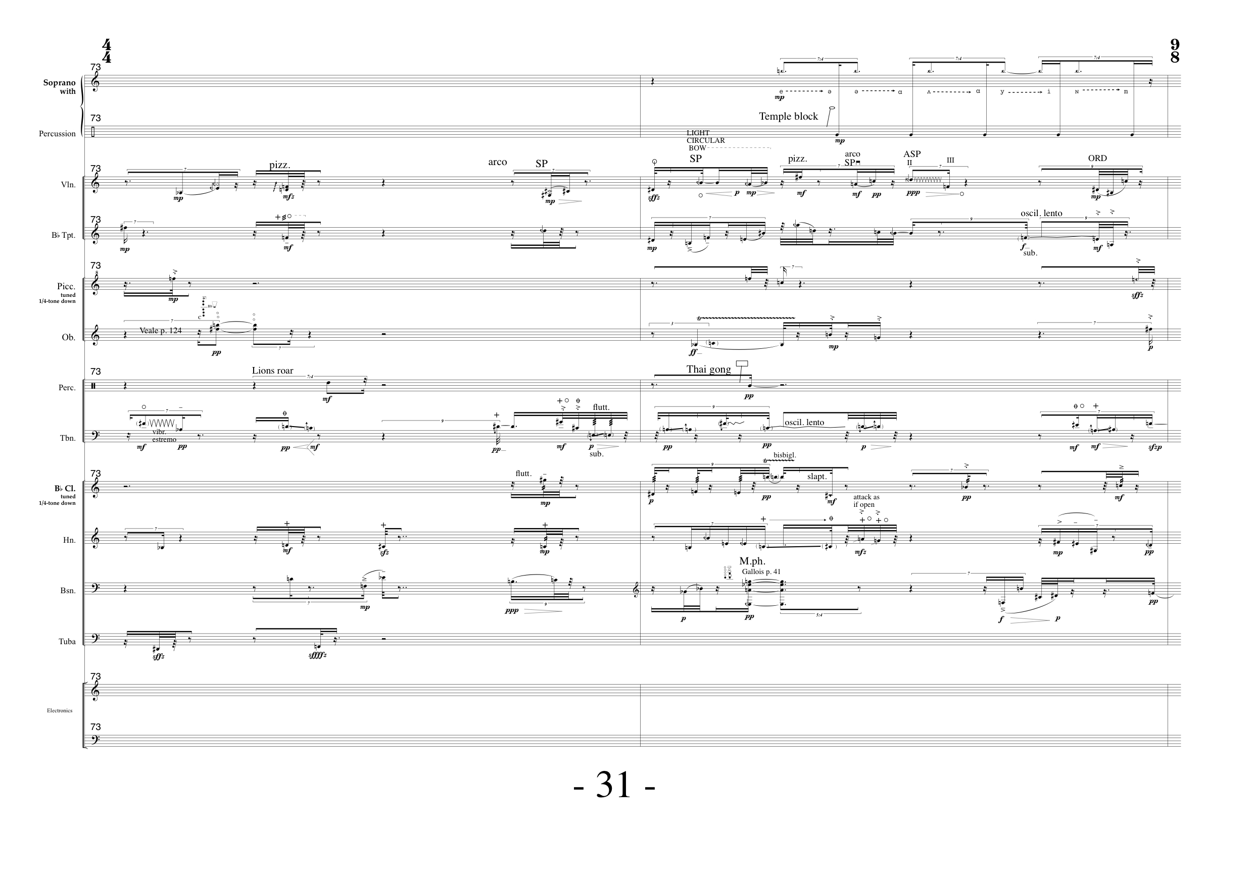 Breathy and noisy qualities of the experienced sounds were transcribed through slightly exaggerated bow bressure and slow bowing for the violins, while the lions roars and tuba multiphonics (the high note is sung together with the played note) created a deep rumbling.