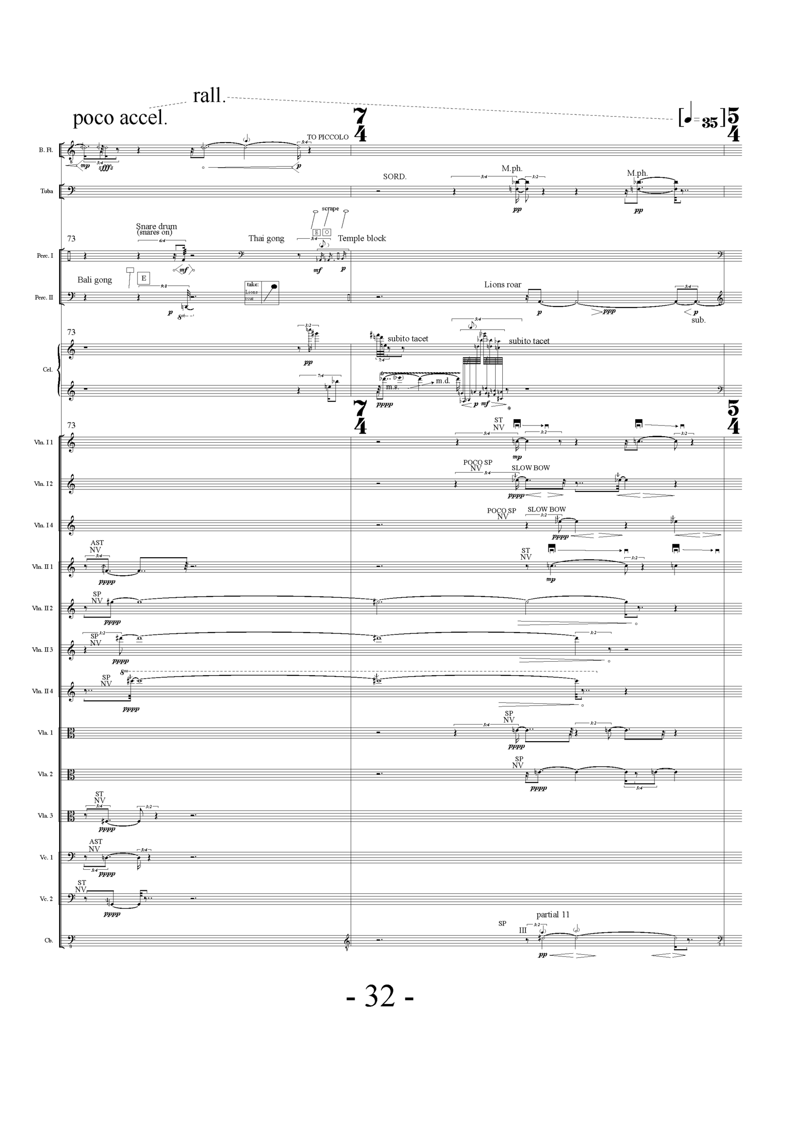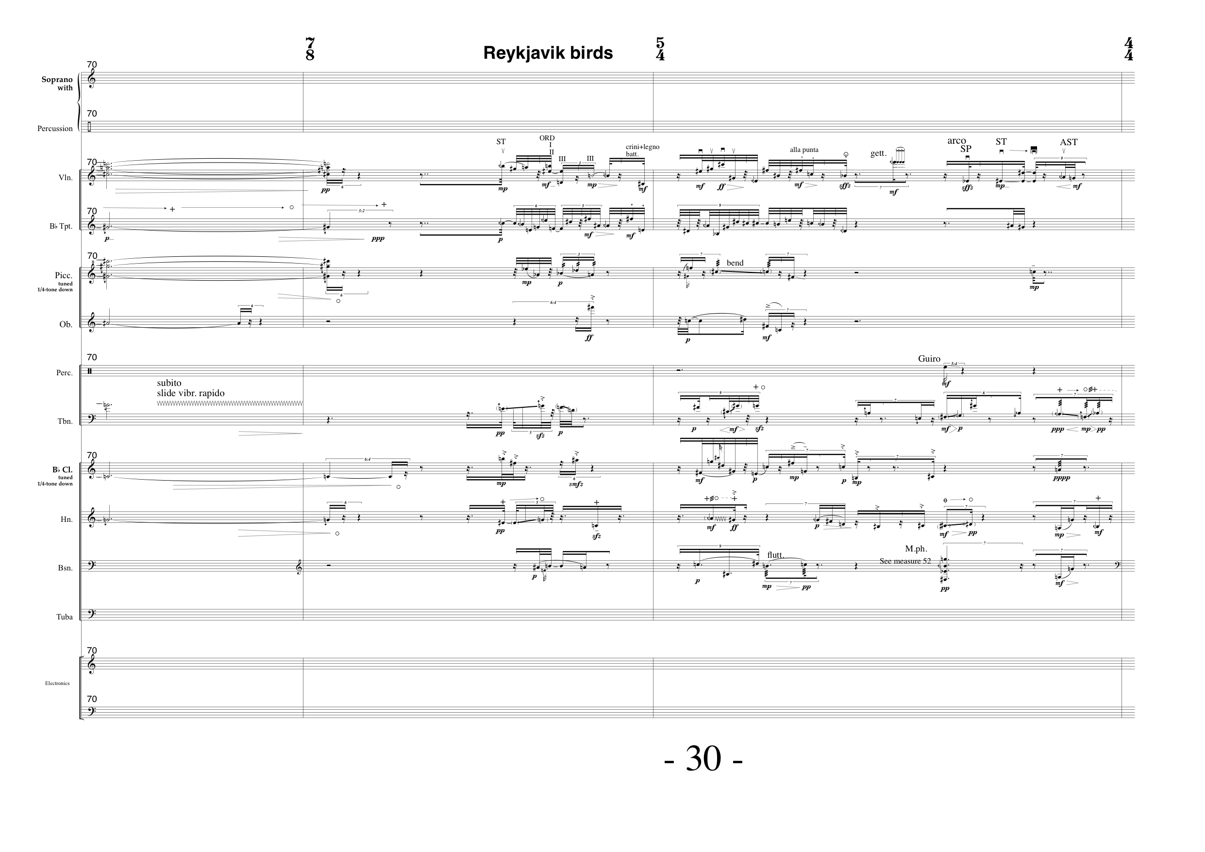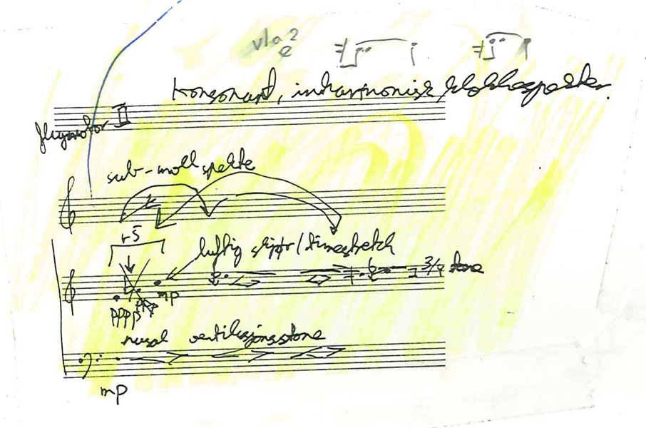 Chronology and tempo was not altered (except for a shorter sections towards the end), the readings are rough scannings of everyday sounds, translated to an instrumental medium, through choice of idiomatic instrumental techniques and sounds. During the composition process, it was possible to choose between multiple paths through a dense material. Goose offer high partials to be performed by the high piccolo or string harmonics. Where a lot of partials had to be cut, sounds could be interpreted by percussion sounds with high frequency spectral energy. Bird concerts were split in shorter and longer parts, alternating with sections of purely spatial ideas. Raw materials above can be traced in the following score excerpt.