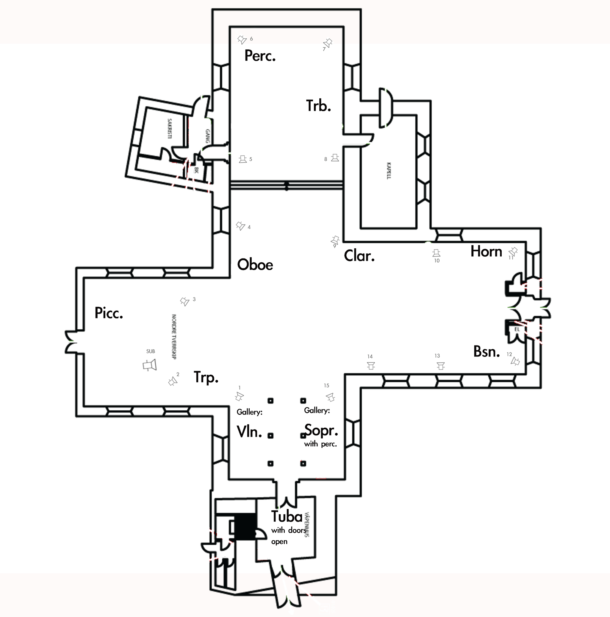 I found the piccolo position, close to the wall, one of the most resonant spots in the room. I had in mind that the piccolo could be naturally amplified by the room. Bjørnar Habbestad suggested from his experiences with the Critical Band project that playing against the walls, standing in an angle where sound will not be damped by your body, also would amplify the sound. The violin and soprano is placed on the organ gallery, and a muted “offstage” tuba could better balance the middle register piccolo.