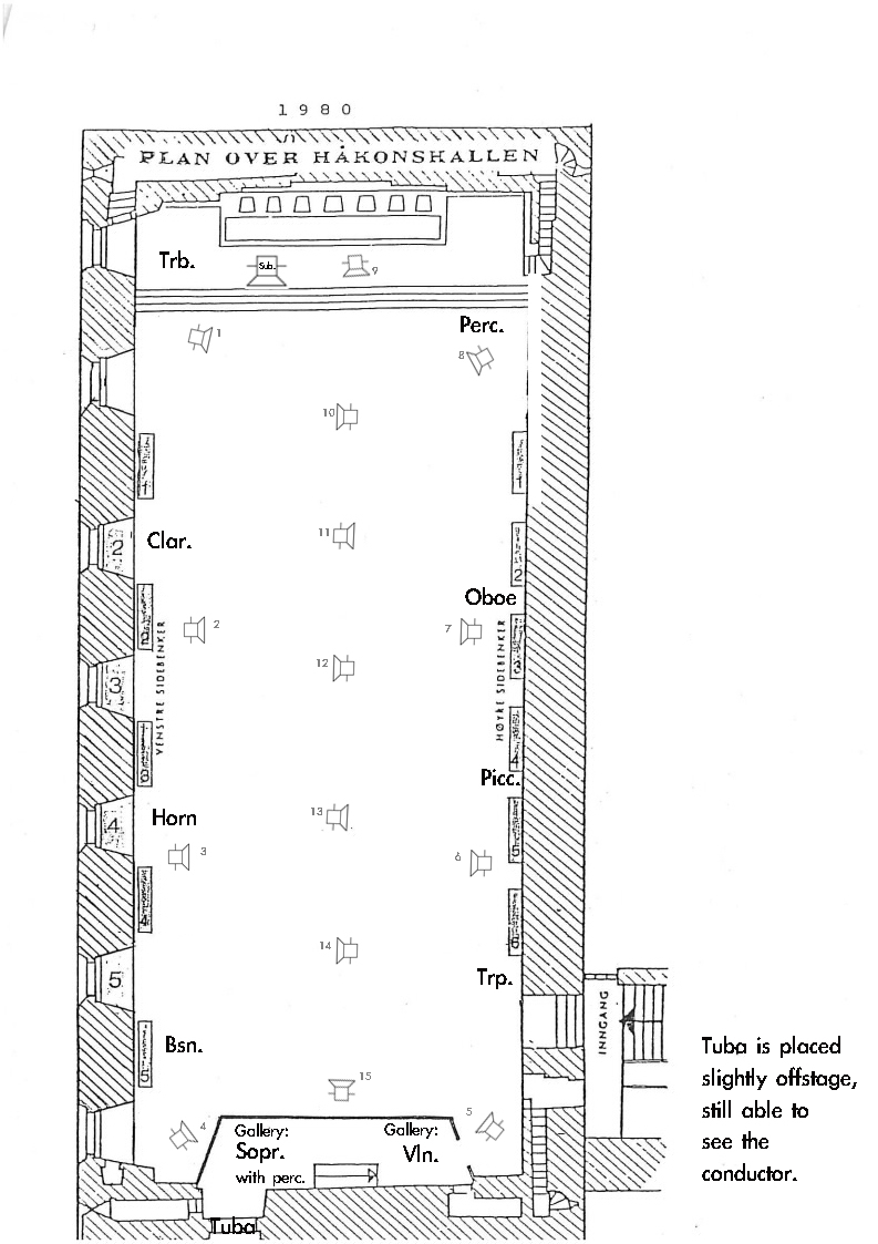 I made an alternative plan for Håkonshallen, Bergen, which is a very different room. Similar ideas of spatial movement could be realized mirroring the setup. A gallery is available for the soprano and violin, while the “offstage” tuba rather would be amplified at this new position, as the stairs down from the hall are very resonant.