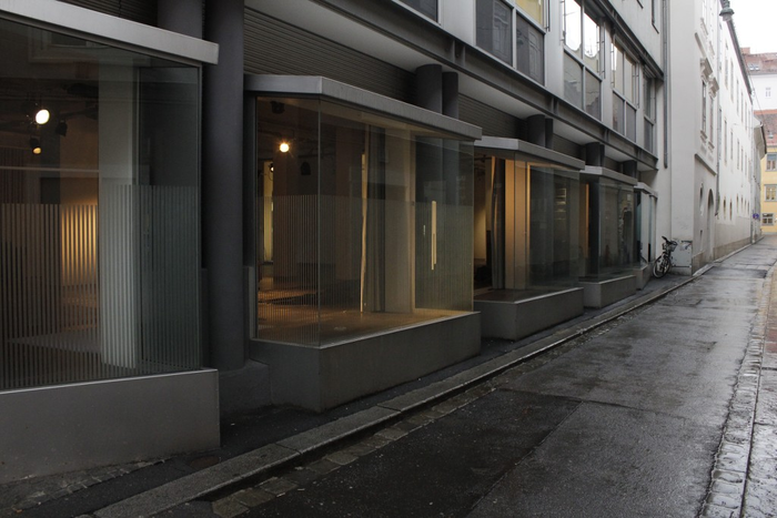 The "new" esc space in the Graz city centre is very different from its previous location in Jakoministraße (a place where we had exhibited before). Very much a "glass box" on the ground level, a lot of passersby look through its windows, you can even see "through" the gallery to the other side of the building.