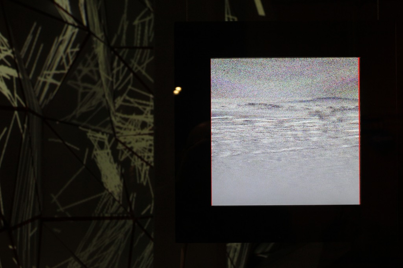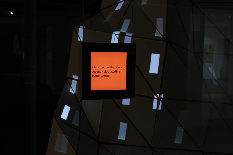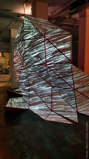 The whole exhibition was built on the premise that it should engage with the people walking by on the outside, and so the "outer skin" of the mesh and its projection are not just an outside on the inside, but equally an object observable from the streets. After the gallery formally went into winter break in the middle of December, we reconfigured the show as it will only be visible from the outside. The red inner space was not accessible any longer, and neither was the multi-channel sound installation. On the other hand, we have installed two additional microphones and eight small speakers, half of them on each side of the building, capable of capturing and projecting sound from/to the street. It was an interesting challenge to transport and transform the work to the outside, giving another rotation to the ensemble of elements.