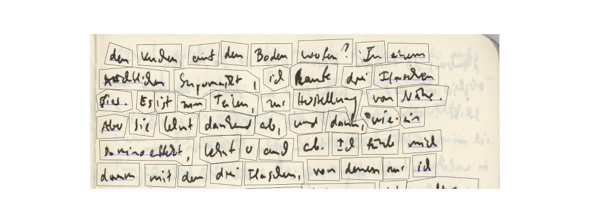 The naturalness of the hand-writing is subverted by having partitioned the scans, taking sentences apart and applying a new line wrapping, adjusting the baseline.