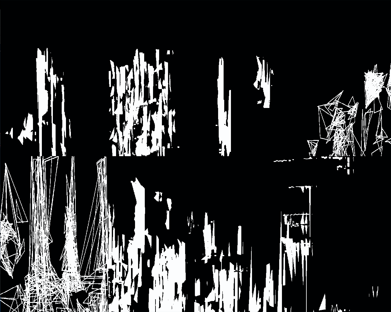 At one point, there was a small glitch in the code that resulted in incomplete erasure of the image background, with triangles extending to the very boundary of the screen leaving behind traces. The trace structure depended highly on the parametrisation of the force-directed animation of the lines. Lines would either appear and disappear, if no preceding or successive coherent triangle was found, or they would by accelerated by this force vector to slide from frame to frame, in this case leaving characteristic curved blotches. The fact that these traces remain still was very interesting to me, giving a counter-point to the expected animation of the graphics. Each iteration, lasting a few minutes, would give rise to one entirely new pattern of traces, and even after watching the process for a very long time, there was always an unforeseen way the interaction between the components of the algorithm would play out. One day, the camera communication had crashed, but the other part of the system was still working, sticking faithfully to the last analysis carried out and producing a strict horizontal lines as the trace pattern, something I had not seen ever before.
