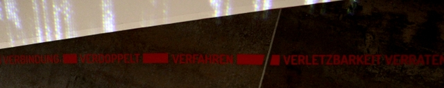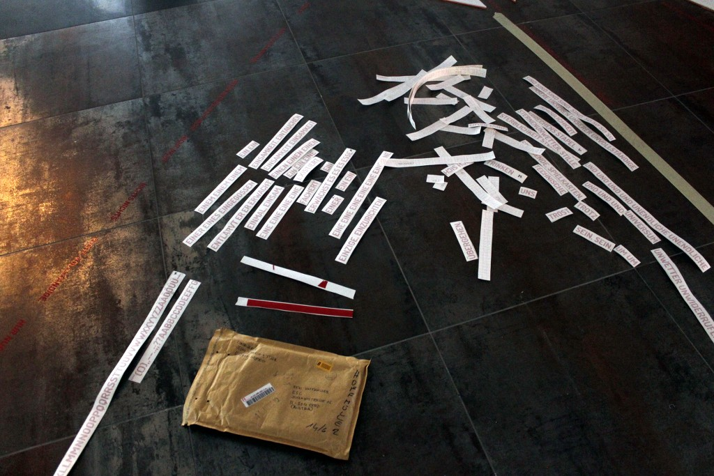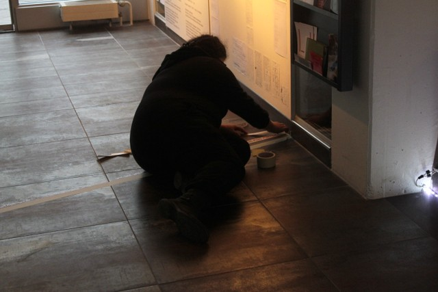 Applying the text became a real performance with various people crawling across the floor, with decisions being made about how to distribute the entire text across the space—in the end, I dropped all the words beginning with the letter 'e', producing an ironic leap from 'durch' (through) to 'falsch' (wrong), and one of the final lines runs across the corridor of the gallery, passing by the office and ending in a bathroom.