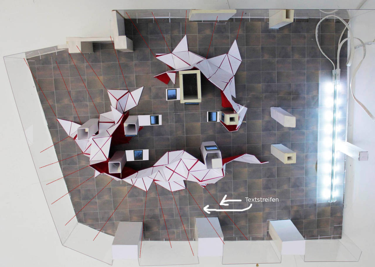 The second was the actual act of installing the text. The concept was to extend the suspended mesh structure into the space, the create vanishing lines of its veins. The exact number of spokes into the space, and their lengths would have to be determined ad hoc, and so for the amount of text—roughly fifty metres—there was an equal stretch of opaque red tape to be able to adjust the run lengths.