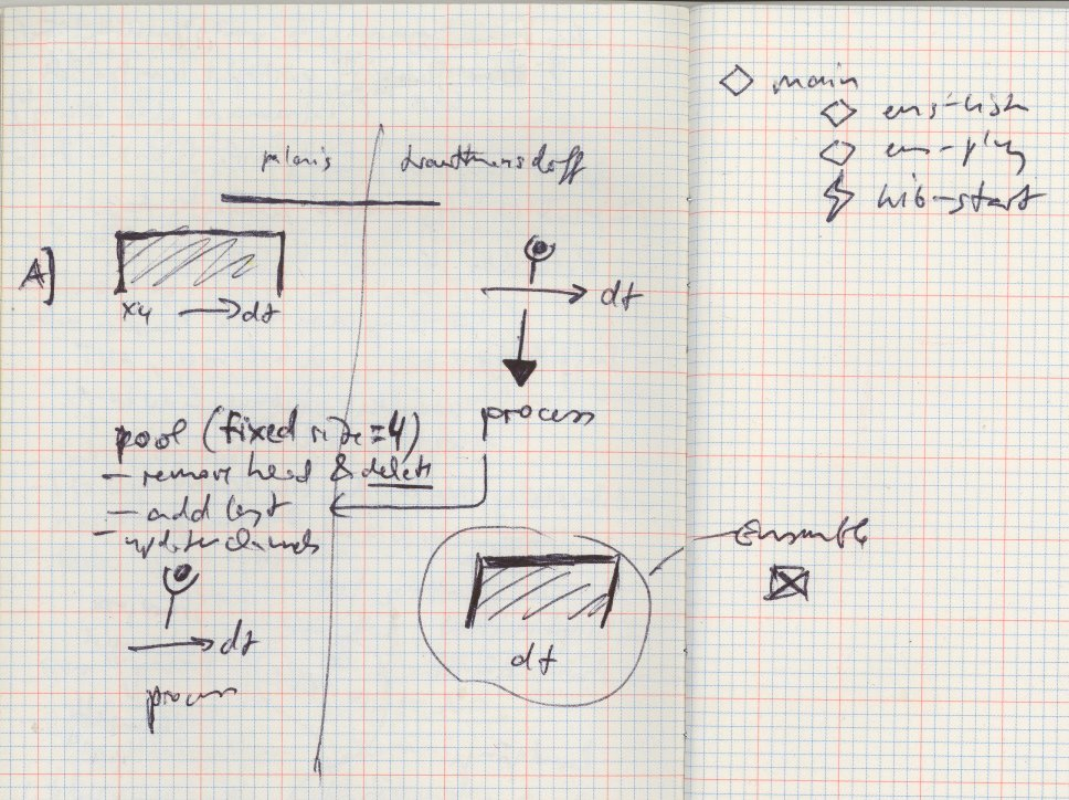 The basic structure of the piece is simple: an algorithm alternatingly records sounds from either side of the building, reduces their temporal information, and injects it to one of the speakers on the opposite side. Each time, a new sound fragment becomes available, the four channels on the corresponding side of projection are passed onto their neighbouring speakers, dropping the oldest fragment and making room for the new fragment. At one time, one thus synchronously perceives the formerly temporal sequence of four snapshots from the opposite side. The gallery space itself is skipped, sounds leap from one side to the other side of the building, as if two instances communicate with each other across a sleeping body.