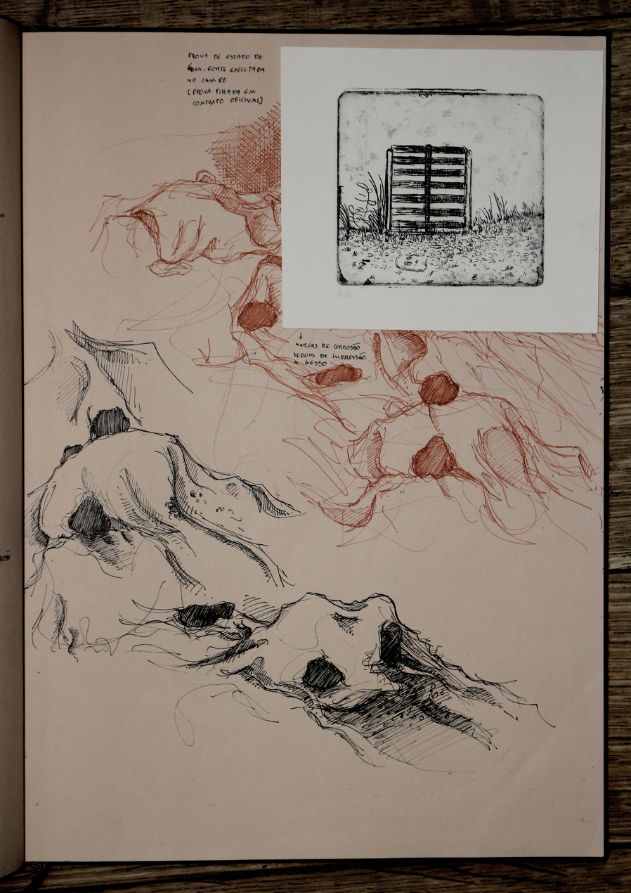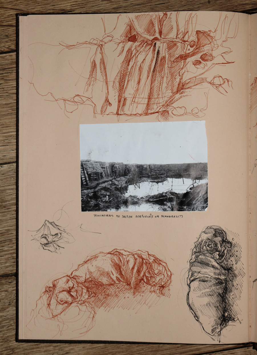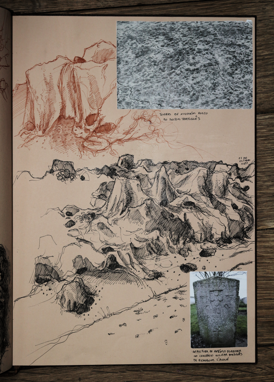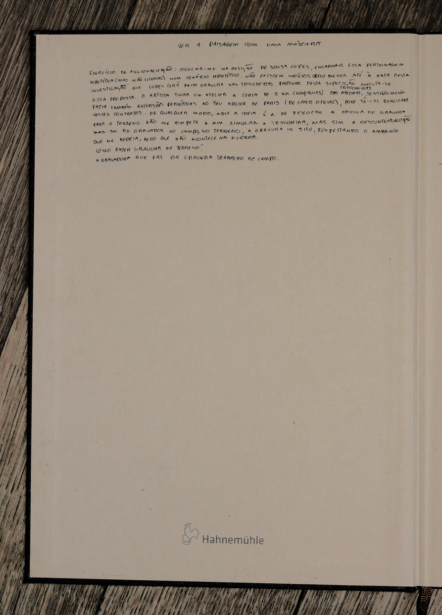 esta exposição apresenta um exercício de ficcionalização da água-fortista no terreno, mais concretamente, nas trincheiras. encarando a gravura enquanto trabalho de campo, fiz espécie de oficina de gravura improvisada in situ, criando uma série de dispositivos no processo. não me cabendo a mim simular uma trincheira, nem tentando fazê-lo, o exercício em si é uma deslocação do corpo, neste caso do meu corpo, no território, uma invocação do trauma da memória da violência no território. o terreno circundante tornou-se, portanto, o espaço de registo da violência, ou pelo menos da memória dessa violência, e o metal o meio de representação dessa mesma violência, receptor da incisão, do corte e da marcação com a ponta seca, o raspador e o brunidor, das reacções químicas que desgastam e corroem o metal para gravar a imagem, e da pressão esmagadora da prensa que transfere a imagem da matriz para o papel. .