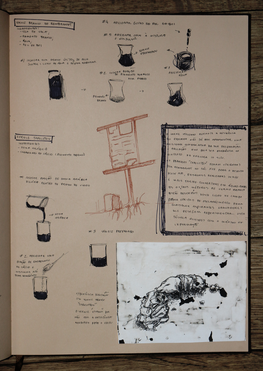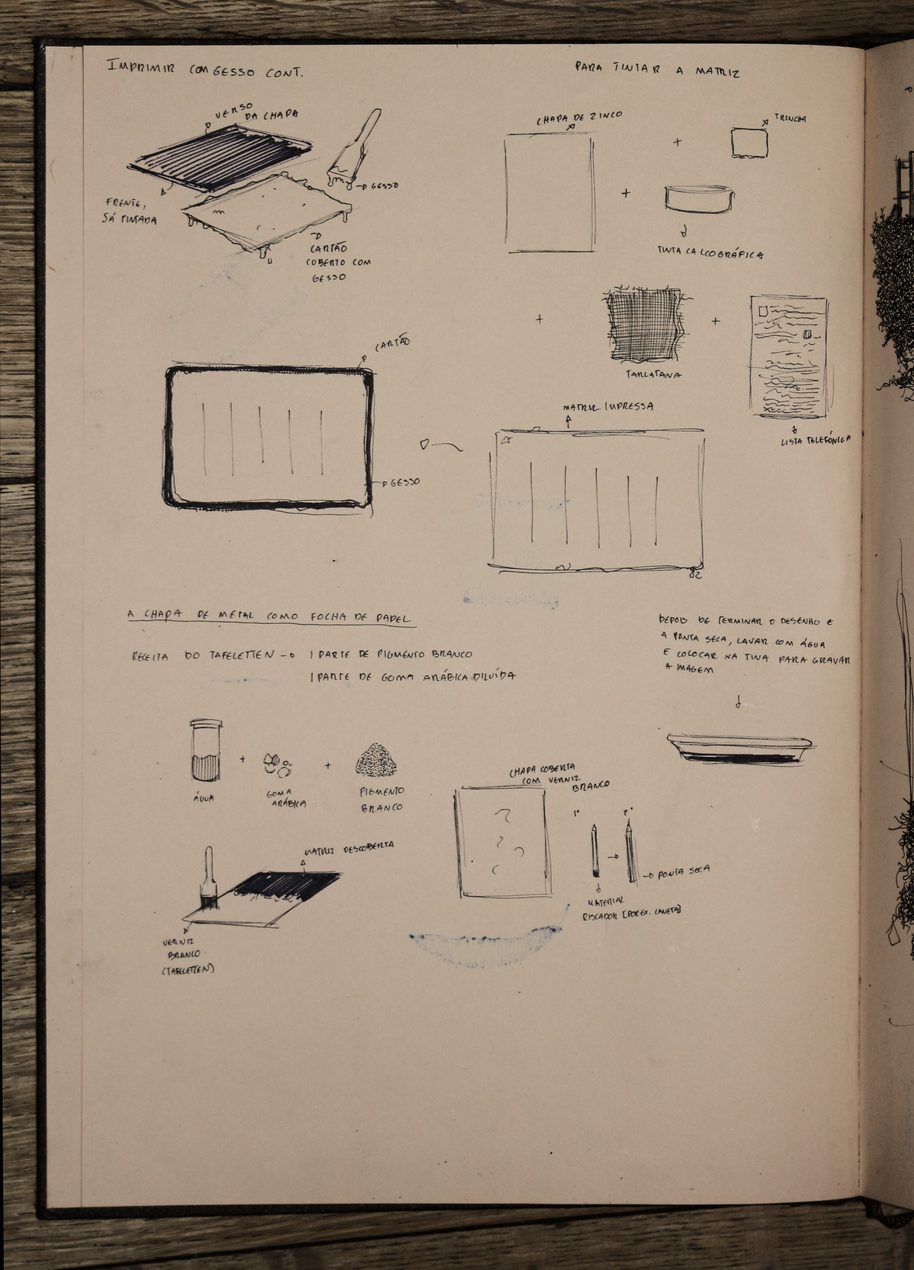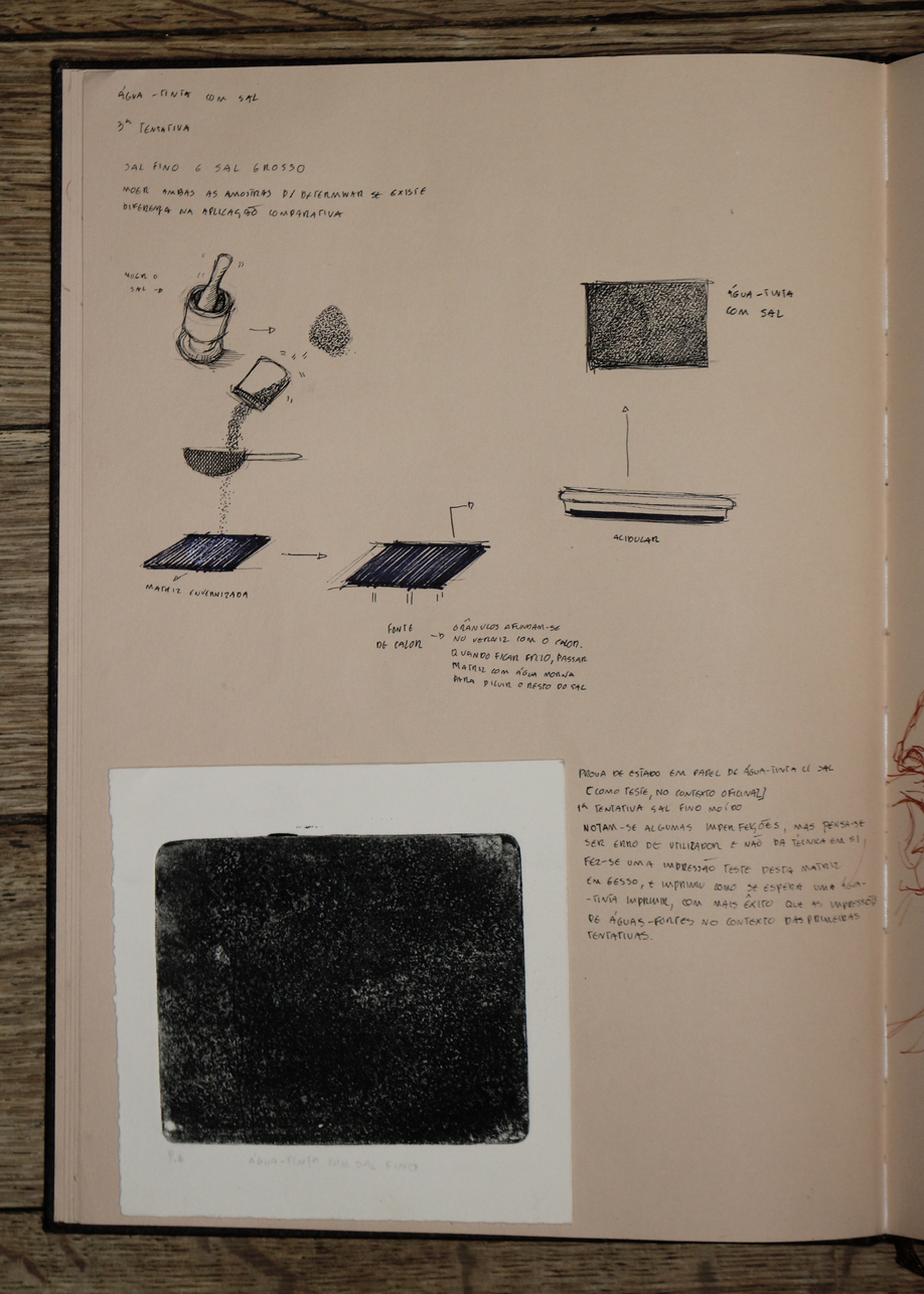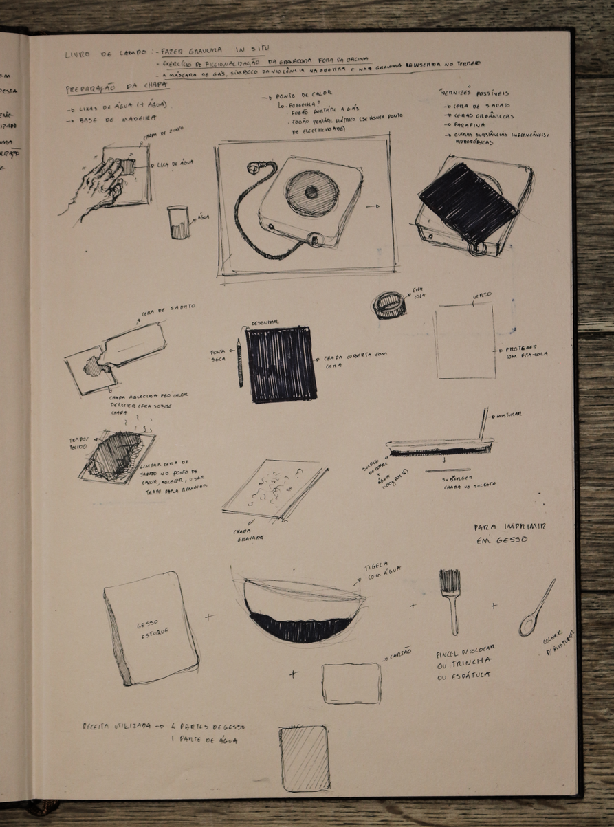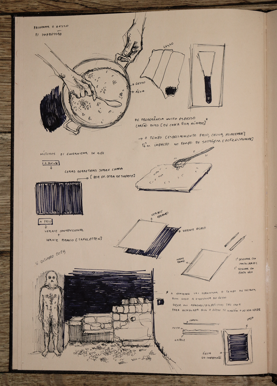 esta exposição apresenta um exercício de ficcionalização da água-fortista no terreno, mais concretamente, nas trincheiras. encarando a gravura enquanto trabalho de campo, fiz espécie de oficina de gravura improvisada in situ, criando uma série de dispositivos no processo. não me cabendo a mim simular uma trincheira, nem tentando fazê-lo, o exercício em si é uma deslocação do corpo, neste caso do meu corpo, no território, uma invocação do trauma da memória da violência no território. o terreno circundante tornou-se, portanto, o espaço de registo da violência, ou pelo menos da memória dessa violência, e o metal o meio de representação dessa mesma violência, receptor da incisão, do corte e da marcação com a ponta seca, o raspador e o brunidor, das reacções químicas que desgastam e corroem o metal para gravar a imagem, e da pressão esmagadora da prensa que transfere a imagem da matriz para o papel. .