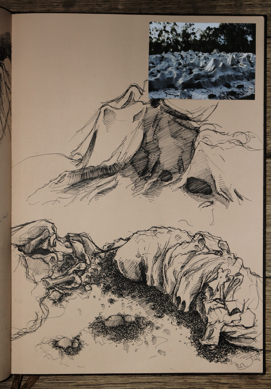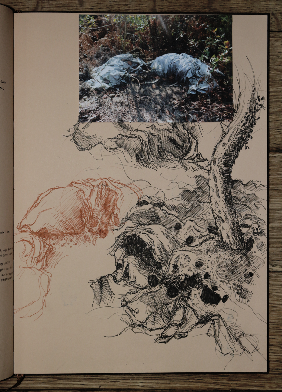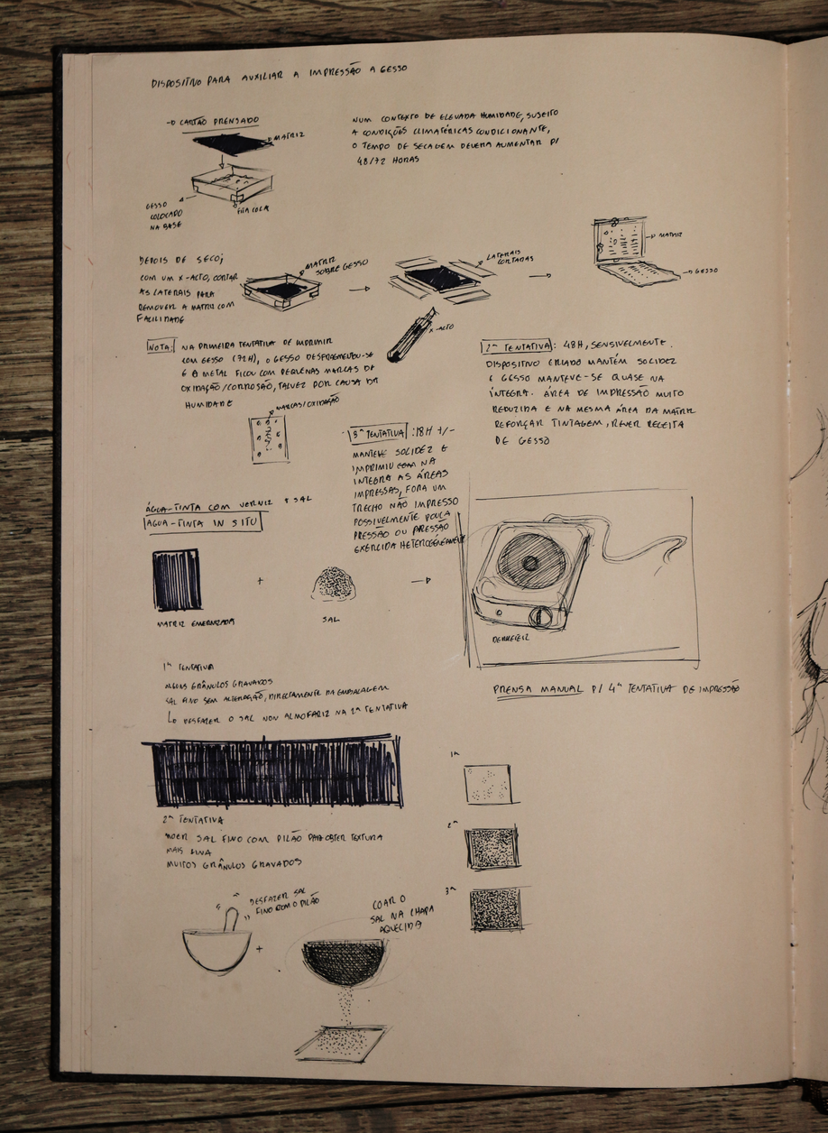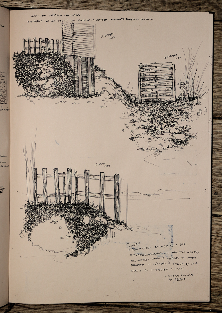 esta exposição apresenta um exercício de ficcionalização da água-fortista no terreno, mais concretamente, nas trincheiras. encarando a gravura enquanto trabalho de campo, fiz espécie de oficina de gravura improvisada in situ, criando uma série de dispositivos no processo. não me cabendo a mim simular uma trincheira, nem tentando fazê-lo, o exercício em si é uma deslocação do corpo, neste caso do meu corpo, no território, uma invocação do trauma da memória da violência no território. o terreno circundante tornou-se, portanto, o espaço de registo da violência, ou pelo menos da memória dessa violência, e o metal o meio de representação dessa mesma violência, receptor da incisão, do corte e da marcação com a ponta seca, o raspador e o brunidor, das reacções químicas que desgastam e corroem o metal para gravar a imagem, e da pressão esmagadora da prensa que transfere a imagem da matriz para o papel. .