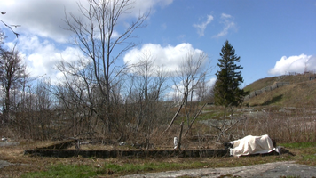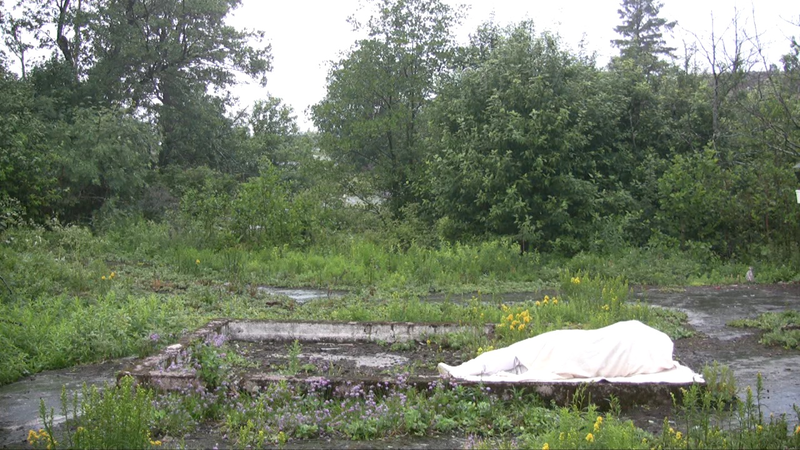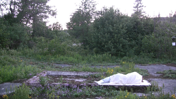 Part 1 (right). Wrapped in a white shawl I lie on the remains of the stone base of a small building on Harakka Island for a day and night with three hour intervals between 24th June 2010 at 5 pm and 25th June 2010 at 5 pm.