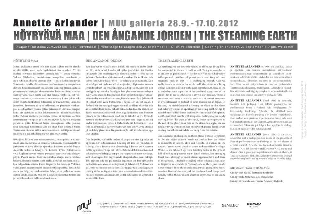 As earthlings we are not only related to all beings living here, but connected to the earth itself as well. To try to consider us as citizens of planet earth — as the poet Velimir Khlebnikov, self-appointed president of planet earth and king of time, suggested back in 1916 — is challenging enough. Can we really have a relation to the earth itself, the planet as a living whole? I am not referring to the Gaia hypothesis, the idea of the extended systemic capacities of the combined ecosystems of the planet, but to the way the earth is alive in earthquakes, volcanic eruptions and seismic activity, such as the recent eruptions at Eyjafjallajökull in Iceland or near Fukushima in Japan. In Finland, the visible bedrock is among the oldest on the planet and relatively stable, so speaking of the living earth brings to mind the myriad life forms that cohabit the surface of the planet, not the semifluid mantle with its spots of boiling magma slowly moving below the crust of the earth, which in proportion to the rest of the planet is as thin as the skin of an apple. We are actually living within the skin of a feverish planet that is slowly cooling from the inside while warming from the outside.