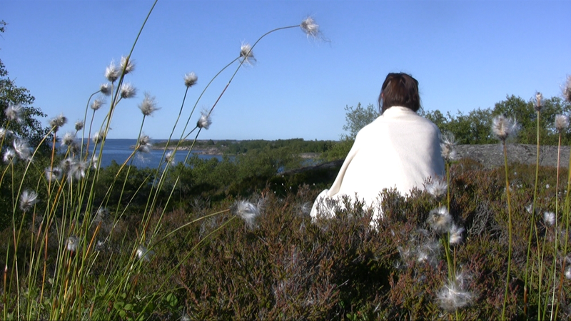 One day in Summer 2010 I sit down for a moment wrapped in a white scarf next to some cotton grass on the island of Kökar in the Åland archipelago.