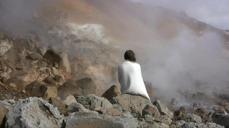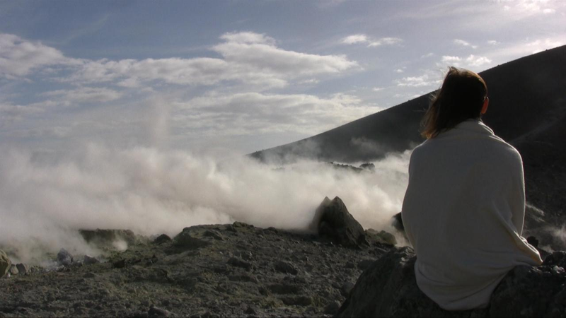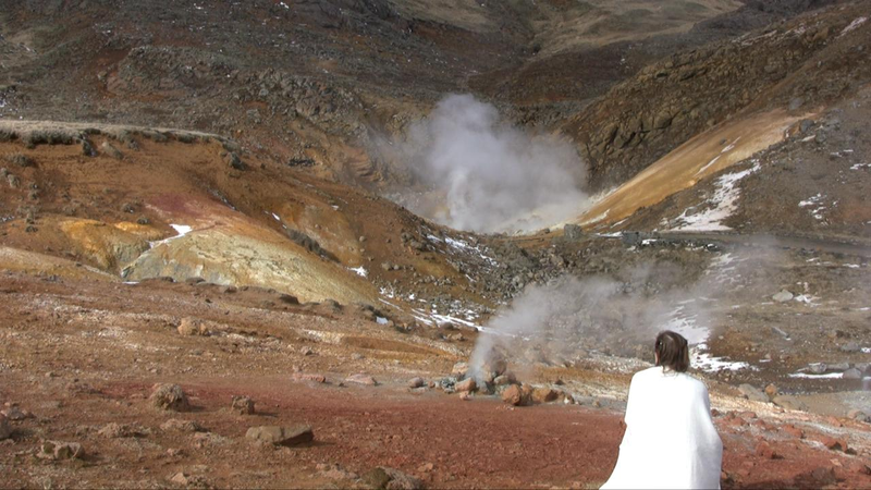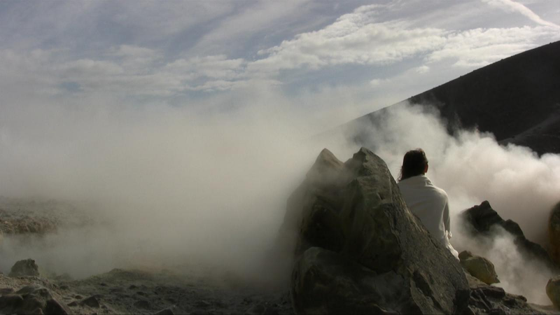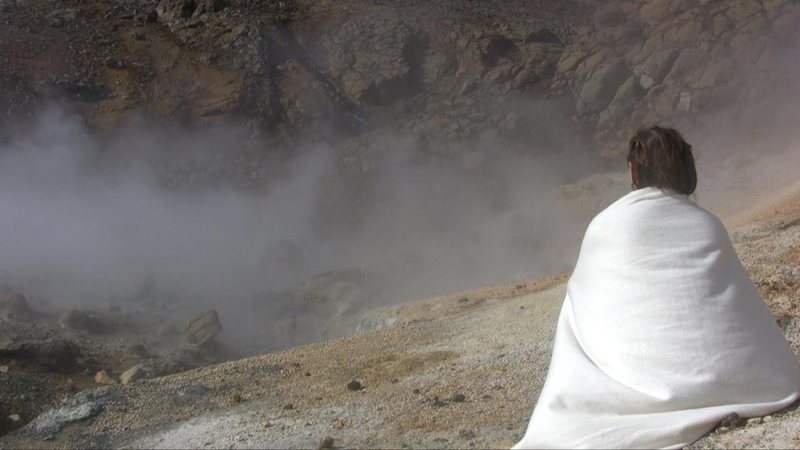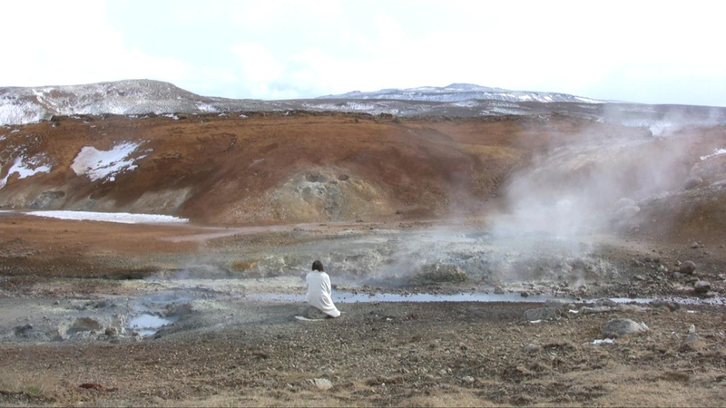 The steaming, stinking soil in those places I chose to perform in for the video camera, made me realize how the planet is constantly in action, alive and volatile. In Furnas on the Azores, I encountered clouds of steam in the middle of a village. White steam billowed up from bubbling holes in the ground full of boiling sulphurous water. Small smokes, like emerging forest fires, although of moist steam, appeared here and there in the ground. I decided to explore other volcanic areas, such as Krýsuvik in Iceland and Vulcano, one of the Lipari Islands north of Sicily. There the entire landscape was giving off vapours; ceaseless flows of steam reveal the condensed and compressed activity within the earth, and create an experience of suppressed chaos.