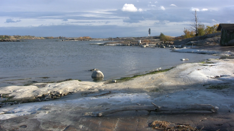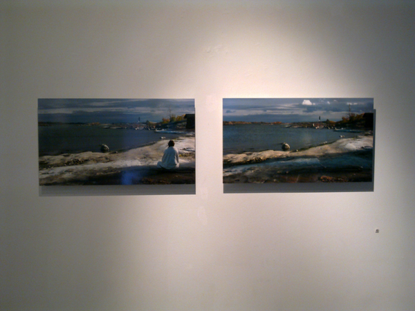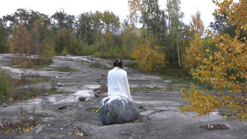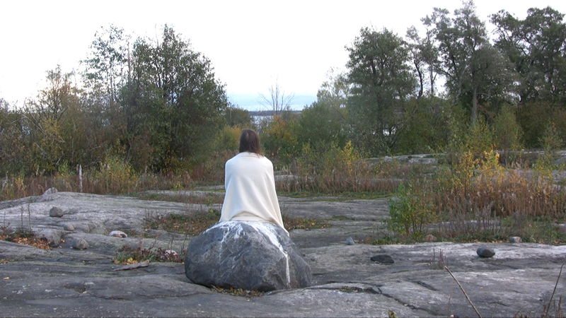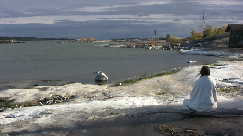 I sit wrapped in a white shawl on the shore on Harakka Island one autumn day 2010, closer to the camera and further away from it.
