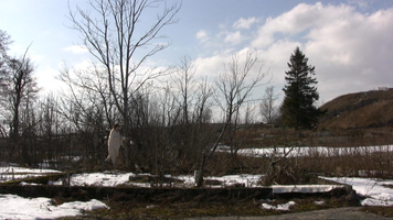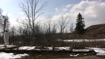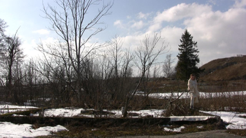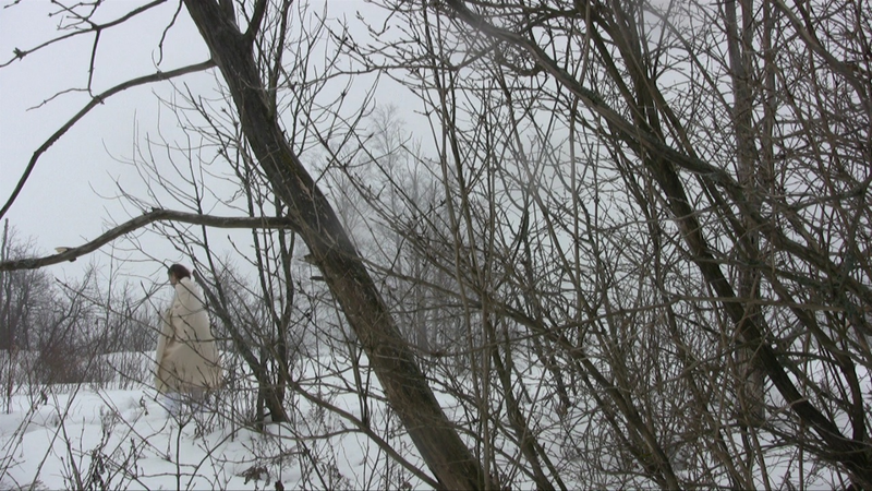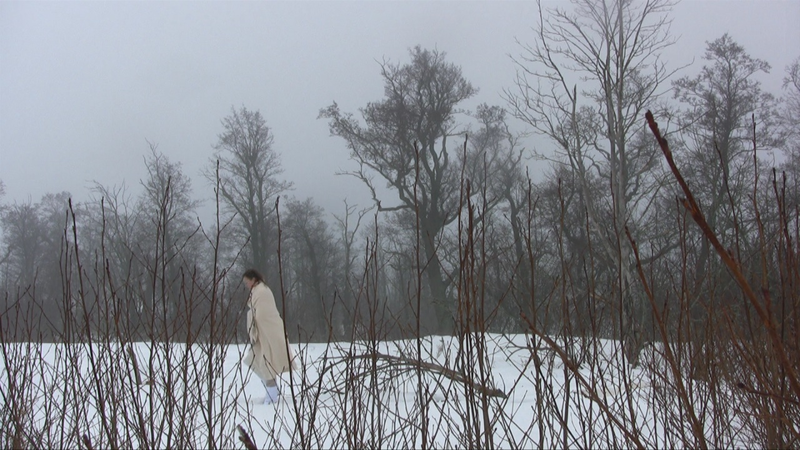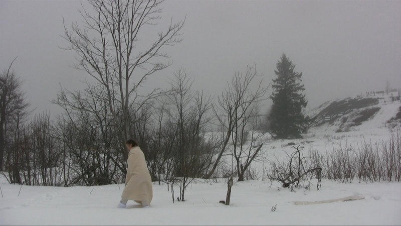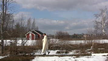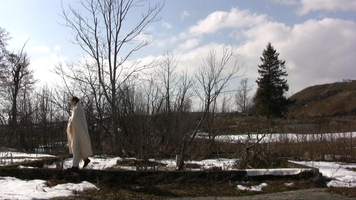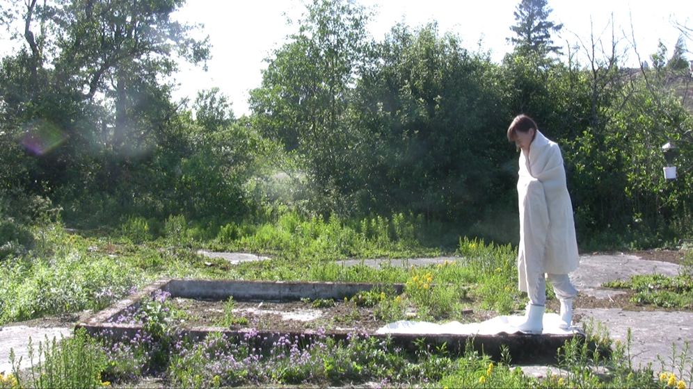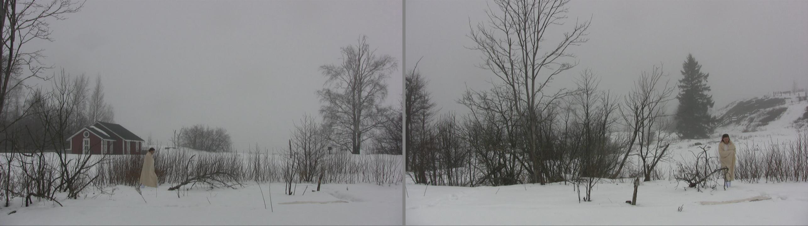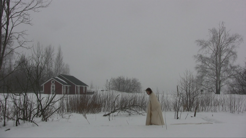 Wrapped in a white shawl I walk on the remains of the stone base of a building in snow on Harakka Island, four times, video filmed from four directions in February 2010.
